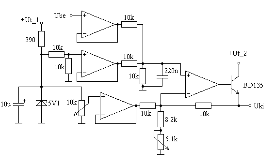 Az ic lehet LM324, a tápja +Ut_1 (földje a föld). A bemenet fix pozitív ofszetet kap, és a visszacsatoló ágban változtatható a 10k-s potival a valódi eltolódás (a fixhez képest). Így akár csökkenthető is a kimeneti feszültségszint. +Ut_1 legyen stabil, minimum 8V. +Ut_1 és +Ut_2 lehet közös, de +Ut_2 beköthető áramkorlátozó ellenállással is. Talán jobb, ha a Zener kisebb feszültségű (finomabb hangolás, nagyobb távolság a táptól, így nagyobb stabilitás). Az 5.1k-s potival az össz erősítést lehet 1-re hangolni. BD135 helyett lehet más is.