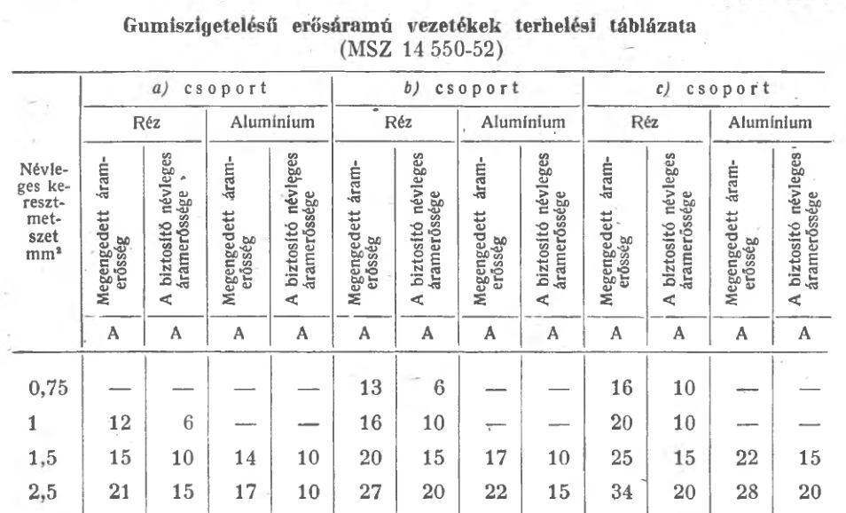 Ha a terhelhetőséget meg­állapítottuk, akkor a biztosító áramerőssége a terhelés értékéhez legközelebb eső, annál kisebb (vagy egyenlő) legyen. Berakom a régit, hogy egyértelmű legyen, miről beszélek, de ez ugye a régi áramerősségekre meg gumiszigetelésű vezetékekre vonatkozott.
