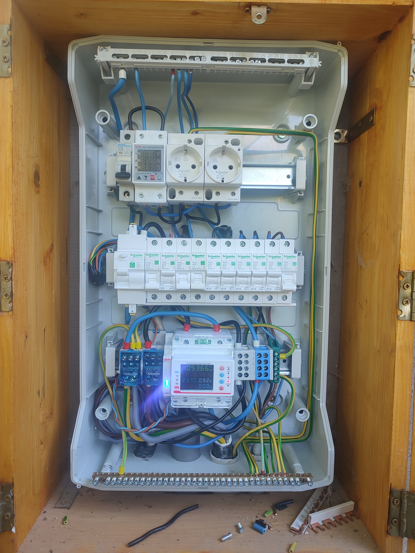 Kint volt a szolgáltató kicserélni a nappali órát s egyben leszedték a BK-s guman táblát is, mert az új fogymérős táblán vannak a kismegszakítók. Nem tudtam jelen lenni, de annyi eszük nem volt hogy legalább a kék és piros épületbe menő vezetéket kicseréljék a közvetlenül mellette lévő lakáselosztóig (2x 40cm vezeték), vagy adjanak helyette egy PEN-t, vagyis kivágták ezt a csomópontot a kismegszakítós tábla alatt, átköthették fővezetési sorkapoccsal és tettek rá egy plombált új guman táblát, amin most nincs semmi. Tudom, ez már regisztrált szerelős feladat, másik szakember tudja csak megcsinálni.