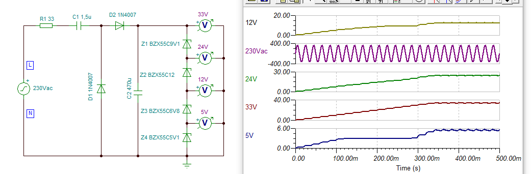 Ez milyen tápegységÜdv!Van egy 20+ éves mosogatógép, amit megjavítottam. Egy kondenzátort kellet kicserélnem. A nyákon a szükséges DC feszültségeket (24-12-5V) ez a bizonyos 1,5 µF 275VAC kondi, egy 33 Ohmos (?) ellenállással együtt és pár diódaféleség (nem tudtam beazonosítani, a képen fekete D1, D2, D3 és képről lemaradt D4 D5) és egy zéner dióda állítja elő. A kondi 1,5µF helyett már csak 260 nF-on üzemelt és a "diódák" között a feszültség is ugrált. pl.: Zéner előtt 3,4-4,2V-okat mértem, attól függően hány indikátor LED világított. Csere után (1,2µF lett, ez volt elérhető) a zéner után stabilan 5,2V jelent meg. Megpróbáltam, többnyire emlékből, lerajzolni a kapcsolást. Tehát a rajz lehet nem pontos, lehet rosszak az szimbólumok irányai (pl: dióda fordítva, R1 lehet 3,3 és nem 33). Csak egy durva vázlat. A kérdésem, hogy ez a fajta "tápegység" hogyan is működik? Hogy kapok egy sorba között ellenállás, kondi és "diódák" egyvelegéből VDC kimeneti feszültséget? SB