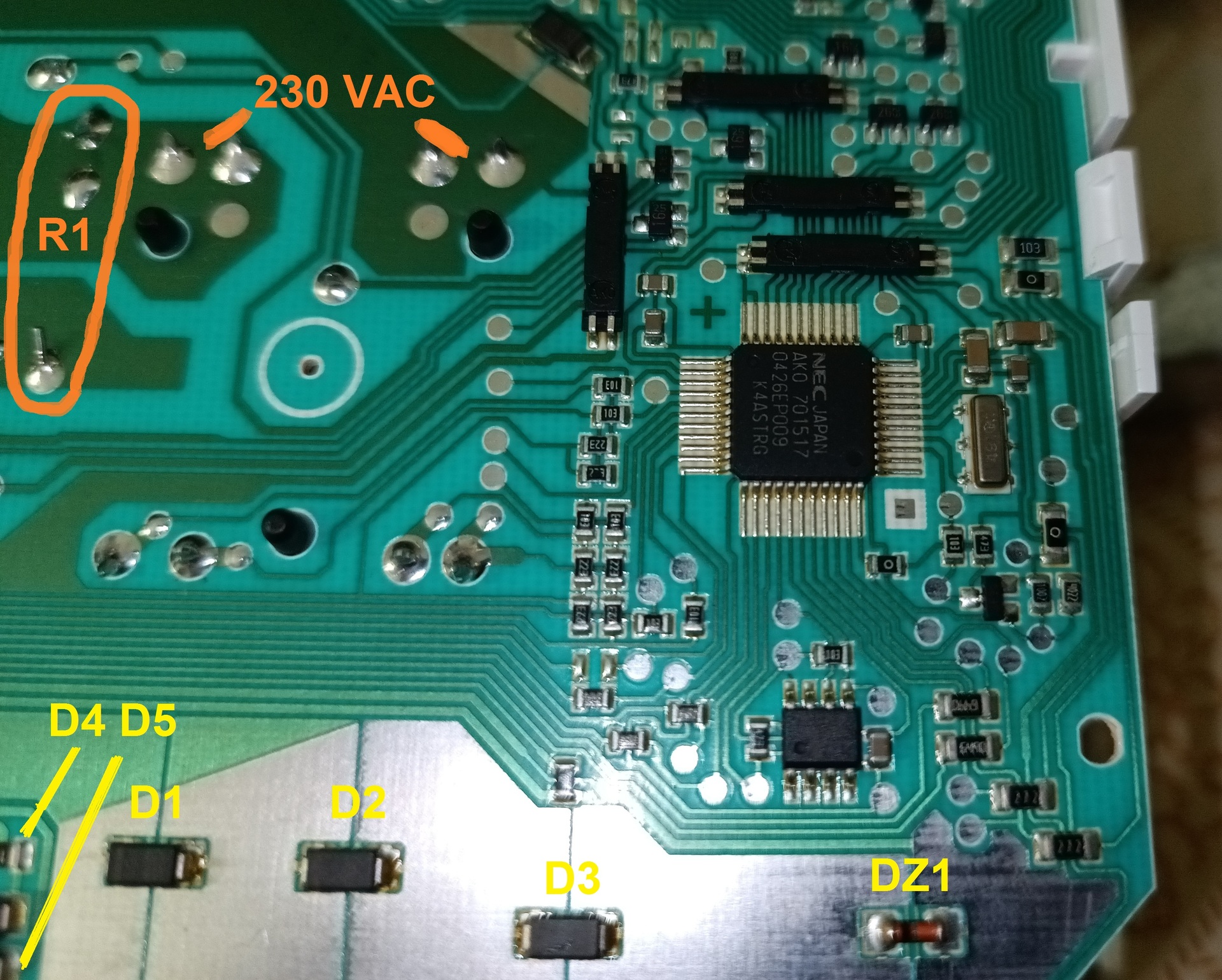 Ez milyen tápegységÜdv!Van egy 20+ éves mosogatógép, amit megjavítottam. Egy kondenzátort kellet kicserélnem. A nyákon a szükséges DC feszültségeket (24-12-5V) ez a bizonyos 1,5 µF 275VAC kondi, egy 33 Ohmos (?) ellenállással együtt és pár diódaféleség (nem tudtam beazonosítani, a képen fekete D1, D2, D3 és képről lemaradt D4 D5) és egy zéner dióda állítja elő. A kondi 1,5µF helyett már csak 260 nF-on üzemelt és a "diódák" között a feszültség is ugrált. pl.: Zéner előtt 3,4-4,2V-okat mértem, attól függően hány indikátor LED világított. Csere után (1,2µF lett, ez volt elérhető) a zéner után stabilan 5,2V jelent meg. Megpróbáltam, többnyire emlékből, lerajzolni a kapcsolást. Tehát a rajz lehet nem pontos, lehet rosszak az szimbólumok irányai (pl: dióda fordítva, R1 lehet 3,3 és nem 33). Csak egy durva vázlat. A kérdésem, hogy ez a fajta "tápegység" hogyan is működik? Hogy kapok egy sorba között ellenállás, kondi és "diódák" egyvelegéből VDC kimeneti feszültséget? SB