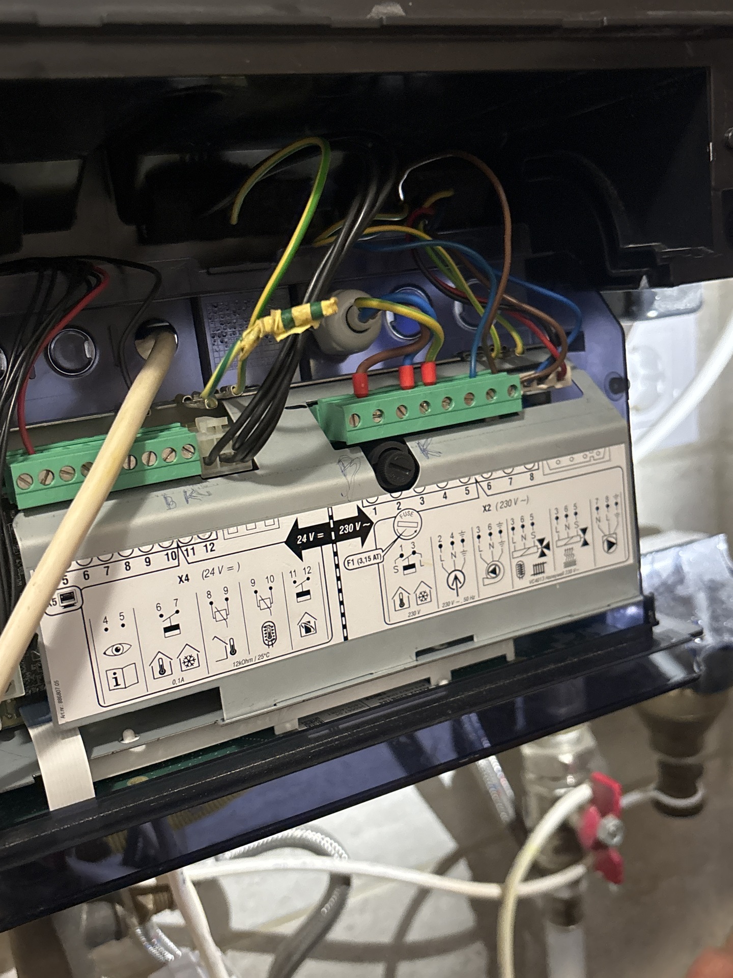 Az X2/2, és X2/4 bekötés az rendben is van, de a védővezetőnek nem az X2/5-ös csatlakozóban lenne a helye. Függetlenül attól, hogy ez így működött. Így a készülékház nincs bekötve a védővezetőhöz, viszont a vezérlőpanelen nem tudni hová megy. Lehet egy relé, vagy félvezető, ami kapcsolja(ta) a háromutú szelepet. Az első bekapcsoláskor az öntesztnél ez a rész zárlatos lehetett emiatt, és tönkrement, vagy elégett egy vezetősáv a panelen. Később már ezért nem verte le a kismegszakítót, vagy a kazánban lévő biztosítékot.