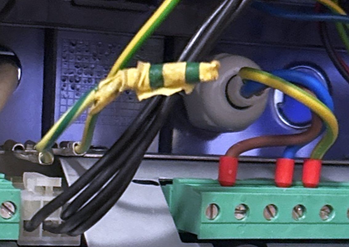 A védőföld drótdarabkája ott van szigszalaggal leszigetelve...valószínűleg oda csatlakozott a betáp védőföldje.