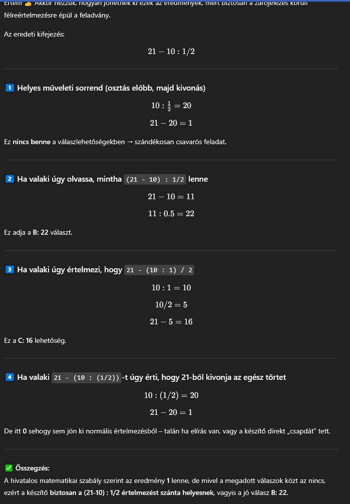Én nem kérdeztem meg a chatGPT-t, csak beírtam a keresőbe a 21-10:1/2 képletet, majd megtaláltam a videót. A D válasz rosszul van közölve, az nem 0 hanem 0!, aminek az eredménye 1.