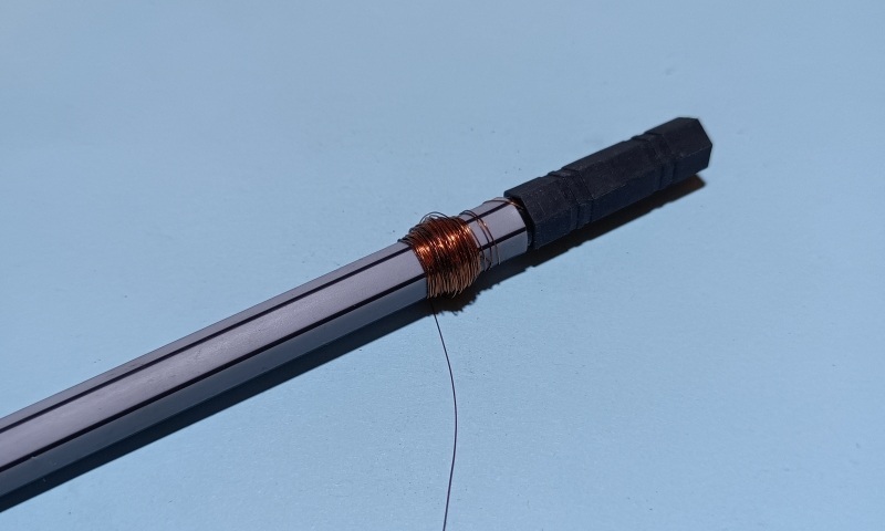 3/4-es gázcsőből levágtam 15 mm-t, leszigeteltem (a szövetszalag nagy előnye, hogy kívül is ragad kissé, így szépen megtartja a már feltekert meneteket), 0,15 mm-es zománchuzalból rátekertem 100 menetet (könnyebb számolás érdekében), majd ismét leszigeteltem.