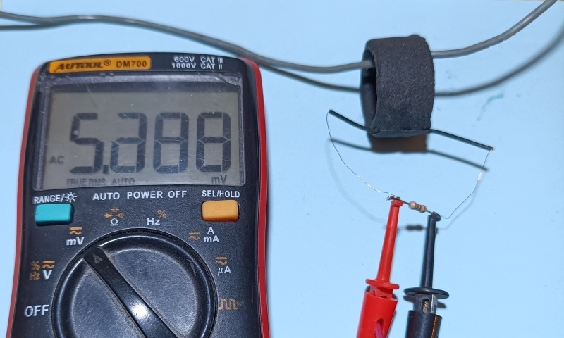 Primer "tekercsnek" átvezettem a gyűrűn 1,6 A váltakozó áramot (ez volt kéznél), a szekunder oldalt lezártam 1k ellenállással, ezen 5,3 mV feszültséget mértem.