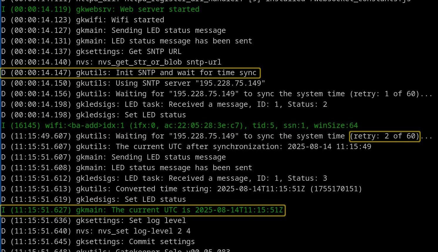 Talán még elfér itt biztatásként, hogy Wifi-n tényleg jól lehet használni az NTP szervereket; a képen egy teszt kedvéért most éppen IP címmel használom (ESP32-n), de a hu.pool.ntp.org-t szoktam megadni. A (nálam) default pool.ntp.org-nak viszont, amíg nincsen ez a beállítás az adott országhoz igazítva, elég időt kell hagyni, irtó lassú szokott lenni, nem véletlen a 60 x 2 másodperc max. várakozás. : -)