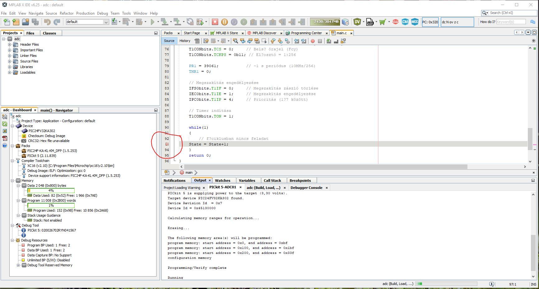 sort eldobja az optimalizáló algoritmus, mert hát minek is pörögni a semmin. Ezzel a töréspont is elveszik. Lehet, hogy nulla szintű optimlizálásnál megmarad, de nem biztos, némi rendezgetést úgy is végrehajt. Memória mentéseSziasztok!Van egy bemenetválasztó panelkám relékkel és ledekkel, gombokkal. Hogyan kell megcsinálni, hogy kikapcsoláskor, jegyezze meg az utolsó állapotokat? Van valami regiszter, ami figyeli a feszültséget, vagy annak csökkenését (BOR), vagy valami (és akkor gyorsan menteném az állapotot)? Vagy pedig, kell egy A/D-t használni, mint feszültségfigyelő. Aztán, ha valamennyi alá megy a tápfeszültség, akkor menti a pic eeprom-ját? 18F2620-at használok. Azt mondta a barátom, hogy minden gombnyomás után kéne menteni, de akkor, szerintem túl sokat írkálnánk a belső eepromot. Így viszont csak egyszer kéne, kikapcsoláskor. Ha tudnátok programozni, hogyan oldanátok meg (elvi síkon)?