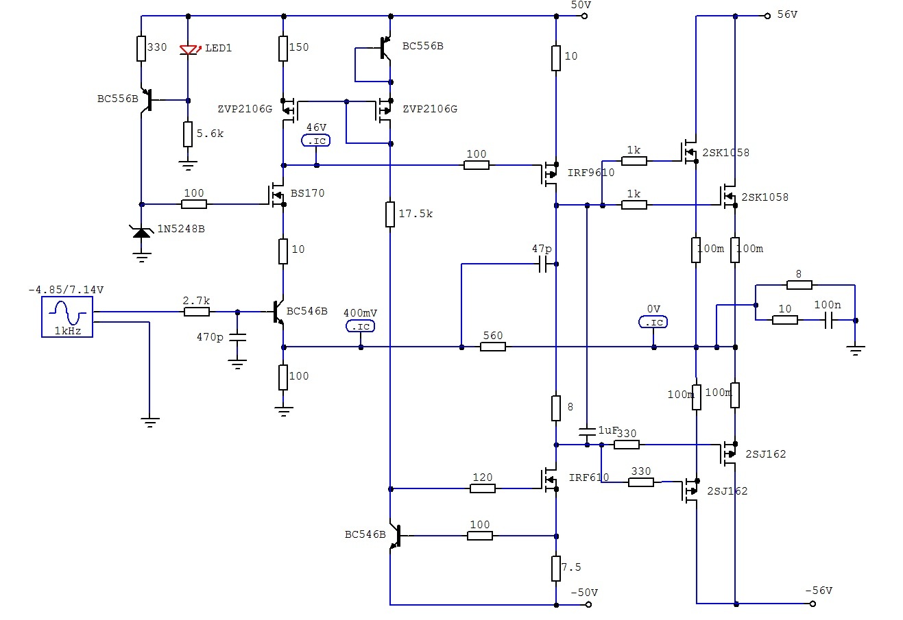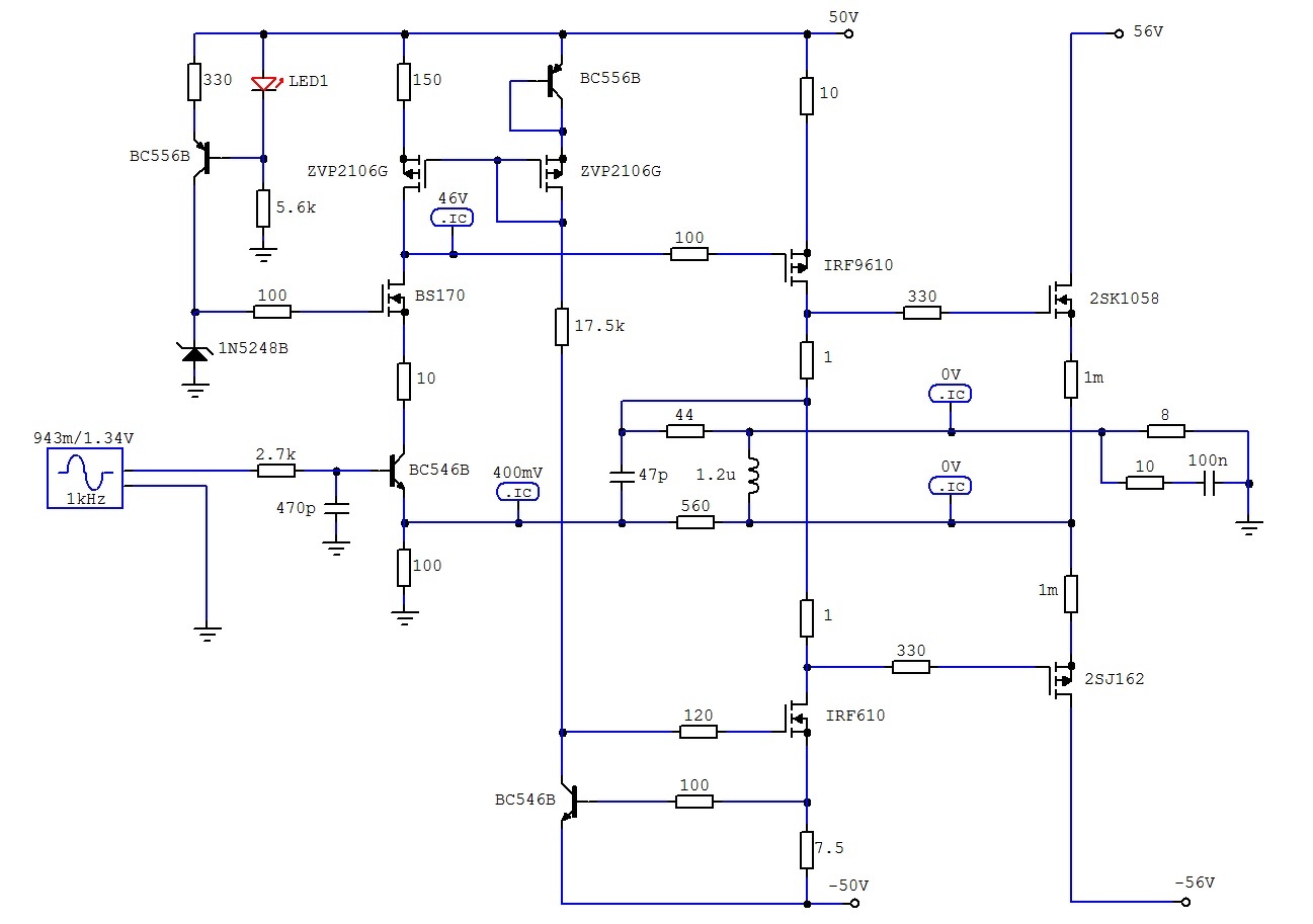 Igazából ez a kapcsolás az, amire annak idején gondoltam, hogy a "current dumping" fokozat is lehetne alapból kis torzítású. Szimpatikus, hogy sok mosfetet használt a tervező, de mint sokszor, itt sem optimális munkaponti körülmények között dolgoznak. Nyilván nem lehet mindenhova a célnak megfelelő félvezetőt gyártani, viszont a meglévő alkatrészekhez lehet igazítani a kapcsolást. Amíg a vákuumcsöves technikában szinte alig térnék el a gyári ajánlástól, a félvezetőket össze-vissza kínozzák. Az ECC83 munkaponti árama szinte minden kapcsolásban 1mA körül van beállítva, mivel itt a legkisebb a torzítása. Ellenpélda, hogy 100uA körüli éheztetett üzemmódban dolgozik az a fokozat, ami a torzított hangot adja a gitárnak. De ha nem ez a cél, akkor jöhet a gombhoz a kabát, azaz a mérnök úrnak kell kiszolgálni a félvezető igényeit. Ezt a hosszú bevezetést azért írtam, mert ahogy látom, beleszerettél a laterális fetekbe. Sok erősítő készítő menekül előlük, mert "drága". Ez persze csak akkor igaz, ha csak arra gondolunk hogy 2SK1058 vagy IRF540. A kész erősítő árához mérten már nem sok vizet zavar az a pár ezres. De hogy ne csak a végfokozatra (vagy hivatalosan a kimeneti source követő) gondoljak, mi lenne ha az ezt megelőző (VAS) fokozat is ezekből a 100mA-en termikusan stabil munkapontban dolgozó fetekből lenne? A 100mA soknak tűnhet ebben a szerepben, de ahogy említettem, ne a tervező akarja már ráerőltetni a szándékait egy alkatrészre. Kalitkába zárjuk a sójmot, a csirkétől meg elvárjuk hogy szárnyaljon. Megesszük a kutyát, a malacot meg beengedjük az ágyba. Szóval ha az a laterális fet 100mA-en akár termikusan stabil maradni, ám legyen. De ha már 100mA, akkor Quad topológia. Akarom mondani "Current damping",mert adja magát hogy az "A" osztályú fokozatot ebből alkossuk. Meg persze "B" osztályú áramerősítő fokozatot is, ami most lehet 100mA nyugalmi áramú "AB" osztályú komplementer szimmetrikus kapcsolás. Itt jött az a pont, hogy már van köze a topik témájához. Majd még folytatom.
