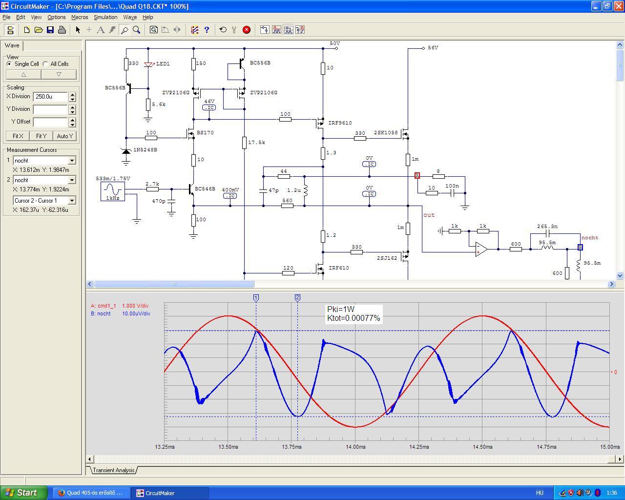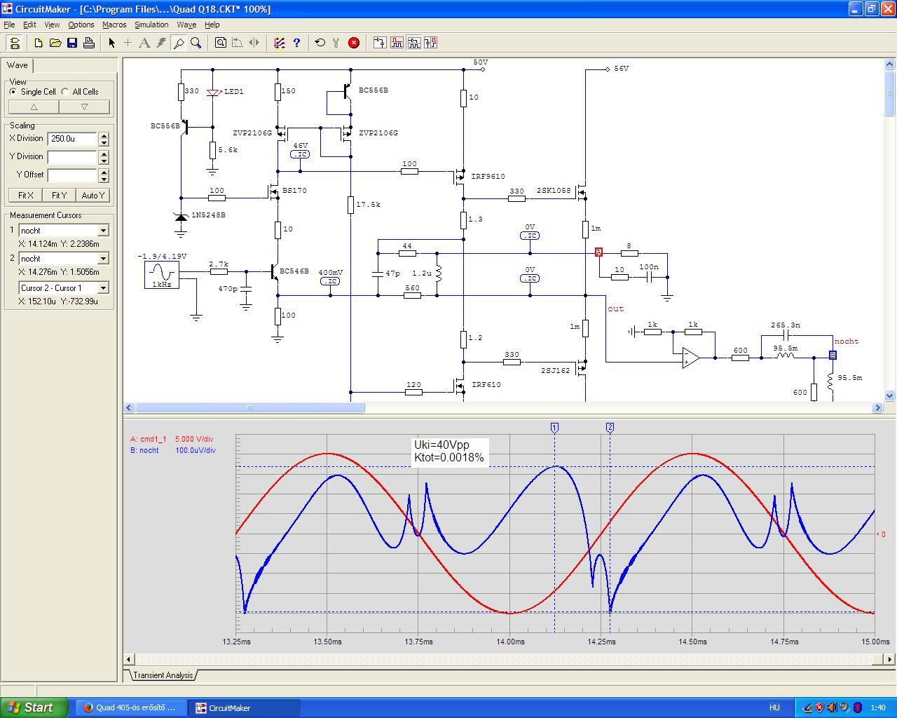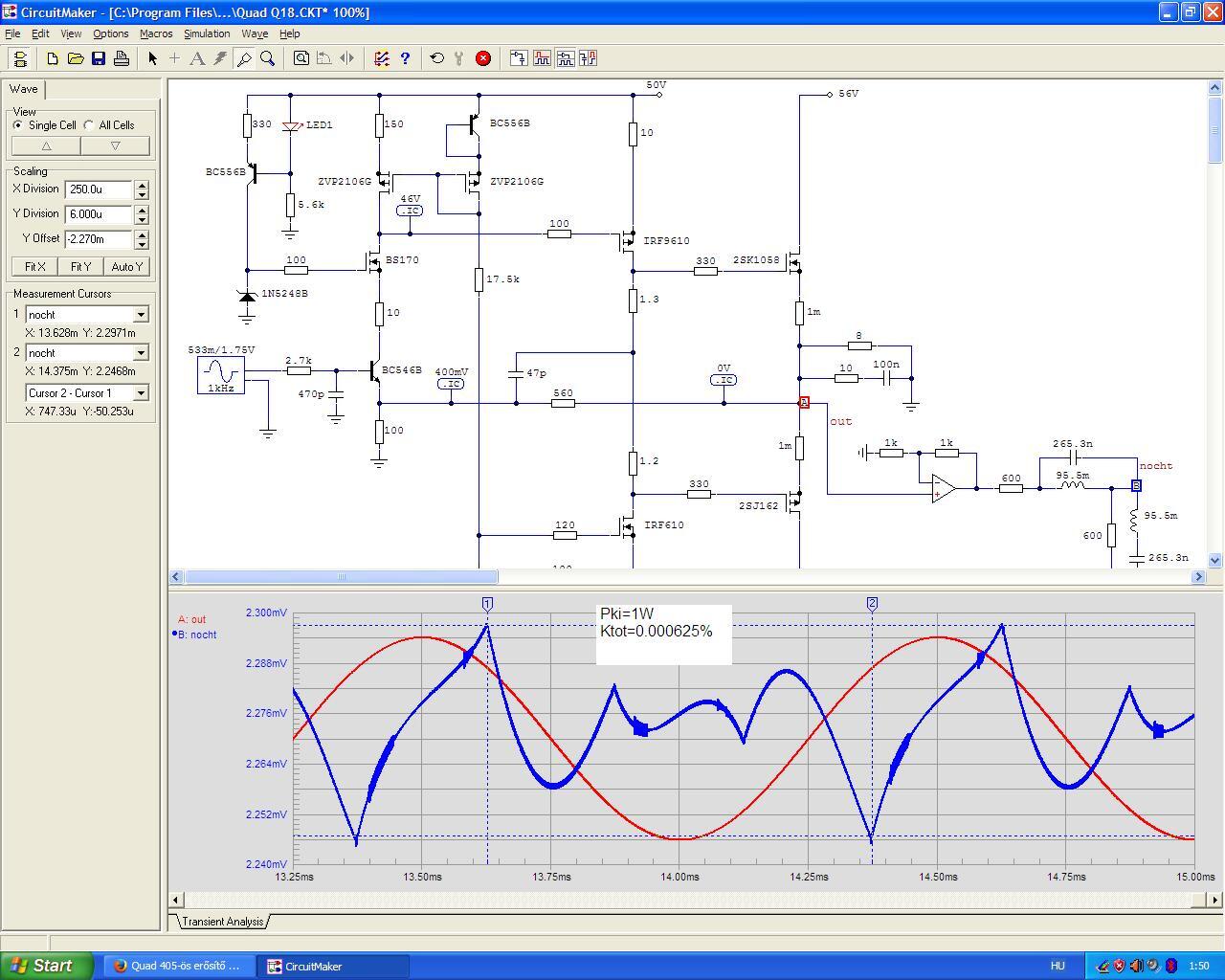 Szóval kezdem azzal amit szimuláltál. A kivezérelhetőség az már régebb óta gondot okozott a QUAD csodánál. A pozitív táp irányában a feszültség fogy el, a negatív táp irányában pedig az áram. Erre már a tervezője is rájött, ezért az eredeti kapcsolásban aszimmetrikusan van előfeszítve a híd. Erre még egy lapáttal rátesz, hogy az IRFP verzióban a magas GS feszültség miatt nem elég az 50mA áram az "A" osztályú fokozatnak, mert azt a feszültséget is teljesítenie kell. Ha duplájára növelem az "A" osztályú fokozat áramát, akkor már nem fogy el. Itt jönne képbe, hogy a laterális fetek éppen ebben az áramtartományban hőmérséklet függetlenek. De ez már egy másik történet.