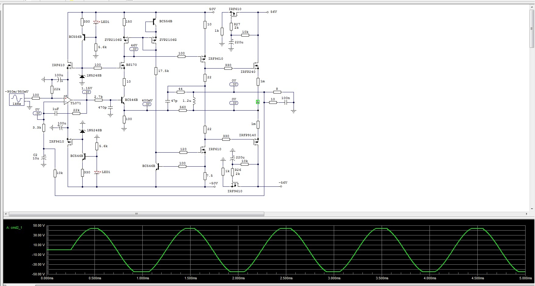 Szóval kezdem azzal amit szimuláltál. A kivezérelhetőség az már régebb óta gondot okozott a QUAD csodánál. A pozitív táp irányában a feszültség fogy el, a negatív táp irányában pedig az áram. Erre már a tervezője is rájött, ezért az eredeti kapcsolásban aszimmetrikusan van előfeszítve a híd. Erre még egy lapáttal rátesz, hogy az IRFP verzióban a magas GS feszültség miatt nem elég az 50mA áram az "A" osztályú fokozatnak, mert azt a feszültséget is teljesítenie kell. Ha duplájára növelem az "A" osztályú fokozat áramát, akkor már nem fogy el. Itt jönne képbe, hogy a laterális fetek éppen ebben az áramtartományban hőmérséklet függetlenek. De ez már egy másik történet.