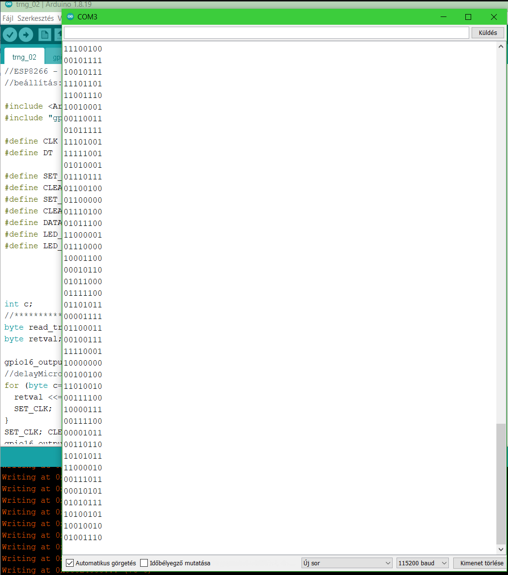 Persze ez még majdnem használhatatlan, és vannak kisebb hardveres problémák, de már kezd valamit csinálni. Bővebben: Link A fenti link nem mindig fog működni, mert még reszelgetem a hardvert is. Olyan is lehet, hogy a link működik, de ha nem megy a hardver akkor nem frissülnek az adatok. Persze ez nem marad ilyen, valamilyen grafikus megjelenítést tervezek, ahol talán értelmet nyerhet (vagy sem), hogy mit is látunk. De egyelőre a hardvernek nagy az offszethibája és ezért a 0/1 bitek valószínűsége egyik trng esetében sem 50%, a legrosszabbik esetében kb. 60 - 40% az arány. Próbálok kezdeni ezzel valamit.