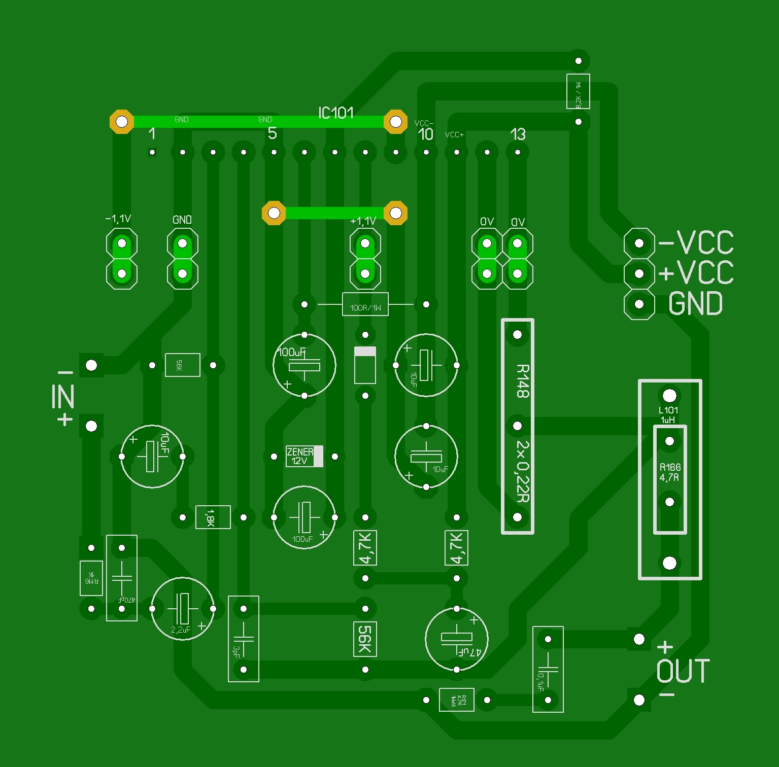 Közben észrevettem hogy az IC 11-es lábára közvetlenül csatlakozó 10µF kondenzátort, a kapcsolási rajzhoz képest fordítva rajzoltam be be, ezt is javítottam.