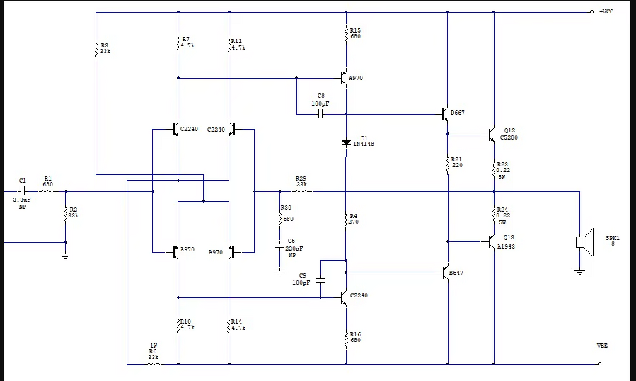 Pedig nem ártana hozzá egy szkóp, mert a rajz alapján esélyes hogy gerjed. Ez a kapcsolás darlingtonokkal ebben a formában nekem még 68pF-okkal is gerjedt. Mivel elég sok gyári erősítőben is megtalálható ez a kapcsolás, előbb azokat érdemes megnézni, hogyan van megoldva. Ott van például a HK AVR1500, abban darlingtonos a vége.