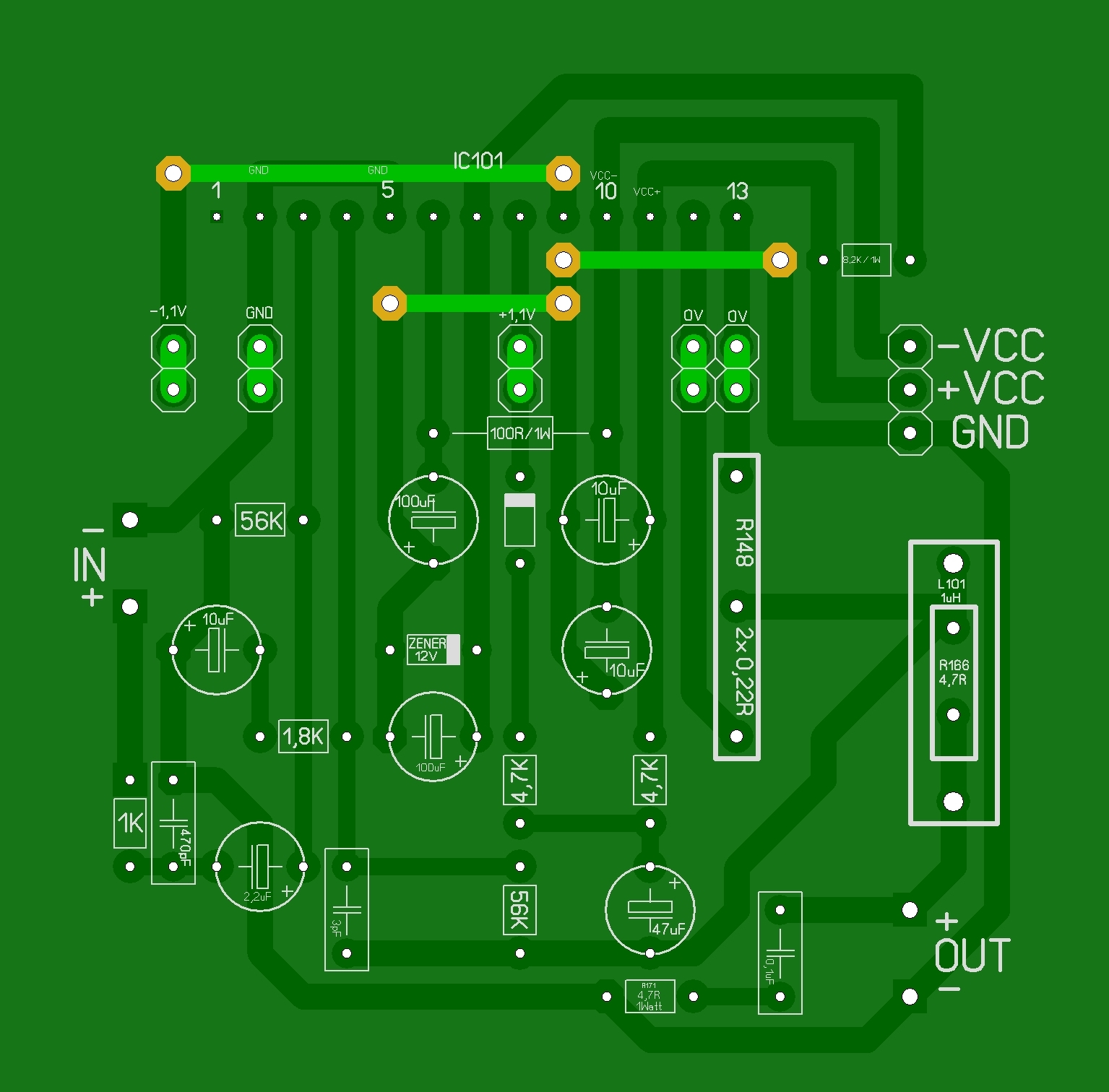 A szűrő kondenzátorok test csatlakozási pontjait áttenném a betáp GND-re. Nem szerencsés, ha a szűrőáramuk a jeltesten folyna, mert abból búgás származhat.