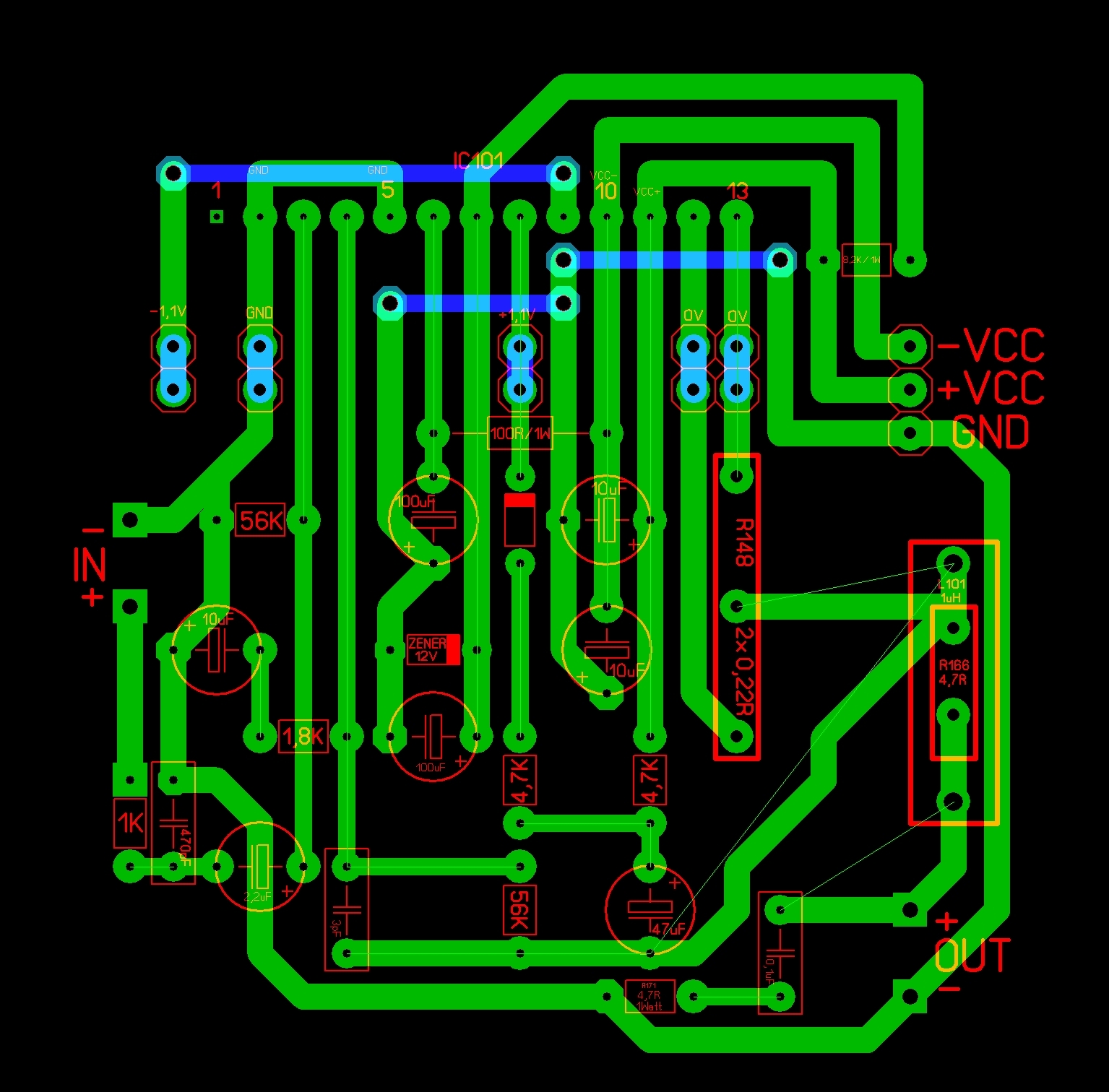 Közben észrevettem hogy az IC 11-es lábára közvetlenül csatlakozó 10µF kondenzátort, a kapcsolási rajzhoz képest fordítva rajzoltam be be, ezt is javítottam.