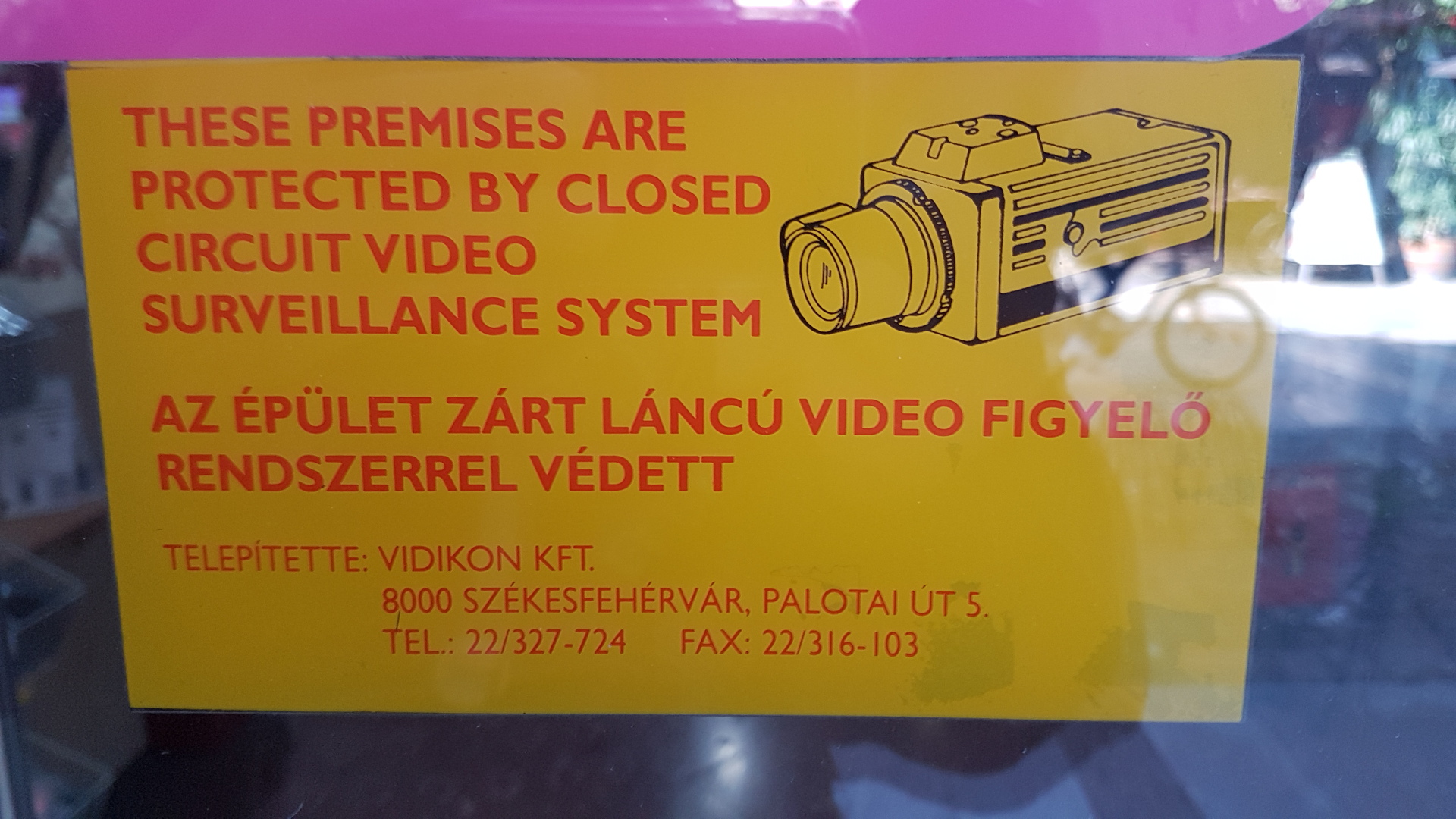 Vidikon video megfigyelő rendszerEzt a régi feliratot Keszthelyen a sétálóutcában lévő kínai üzlet bejáratán találtam ‒ bent az egyik oszlopon lévő egyik tükrön is van még egy! Természetesen mára már teljesen modern rendszer működik az üzletben, de erre akkor se számítottam, hogy ilyenek is ott maradhattak még.