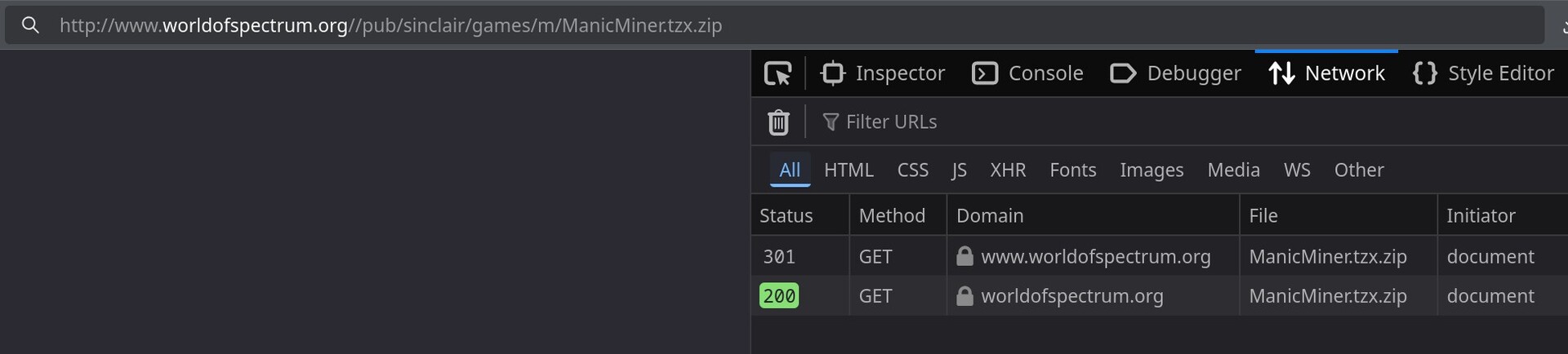 Próbáld ki így, és működni fog: http://worldofspectrum.org//pub/sinclair/games/m/ManicMiner.tzx.zip