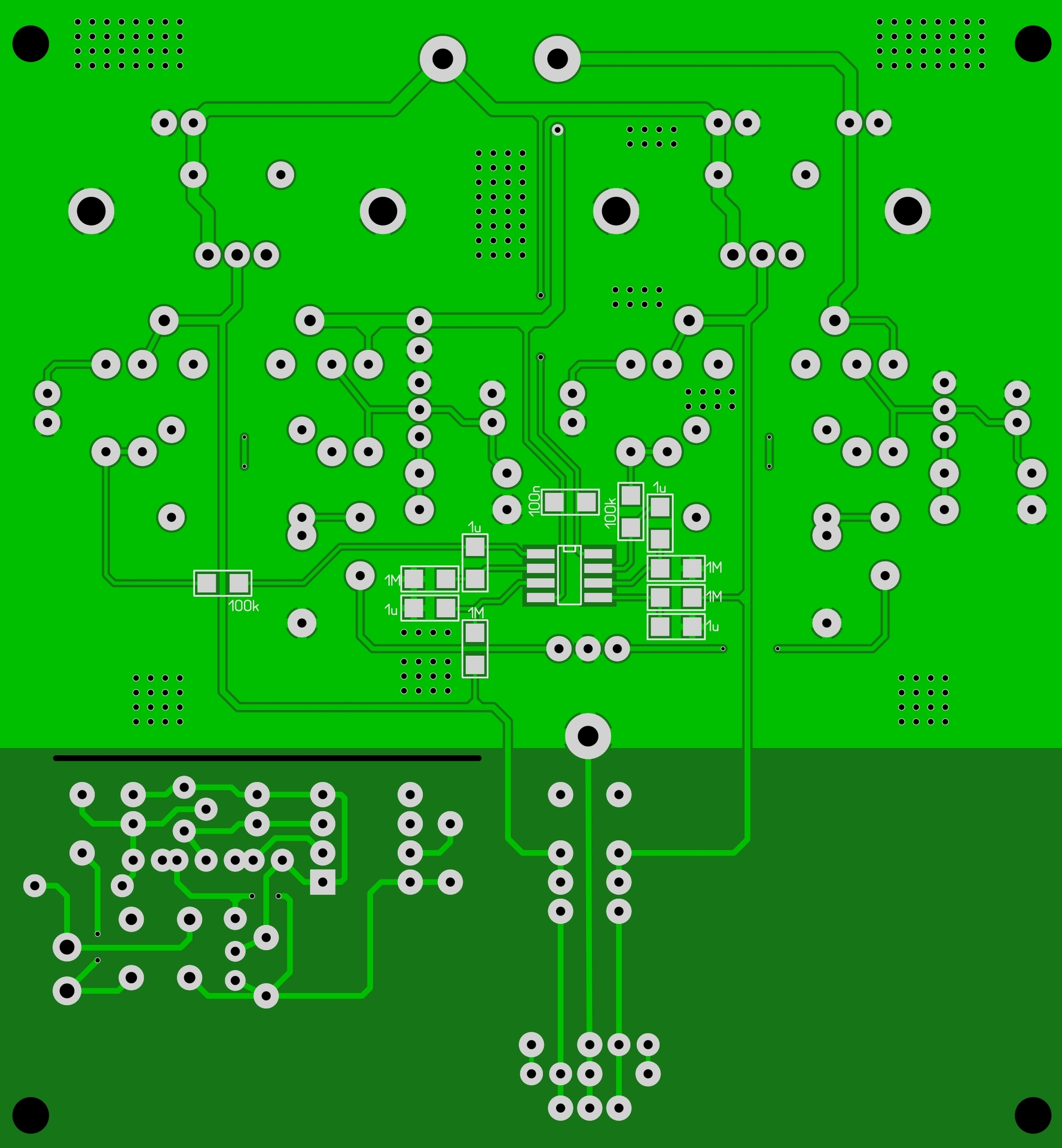Ilyen, elrendezés nem szimmetrikus de az most nem számít gyorsan készült... Kimenetet komparátor kapcsolja relén keresztül kb. 3-4mp késleltetéssel, van hely zobelnek is ha bedurvulna, dc szervo szükség esetén betehető alulra pl. TL072 vagy valami jobb fetes bemenetű, a 2k7-re felépíthető a korábbi trimmeres megoldás pl. melegragasztóval.