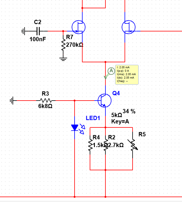 Ilyenre. Csak a LED-en elég 2mA-t átfolyatni. Kis fényerejű piros legyen. Elég egy 470ohmos emitter ellenállás.