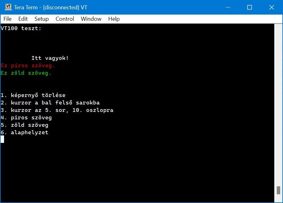 1. Miért lenne egyszerűbb az Arduino monitor használata egy hozzá nem értőnek, mint egy másfajta terminál? Miért kellene egy terminál emulációval rendelkező programon bármit is állítani ahhoz, hogy működjenek rajta az Esc szekvenciák, vagyis miből gondolod látatlanban, hogy szükséges? A Tera Term és társai eleve az úgynevezett VT100 terminál-emulációval indulnak, ami képes az Esc-szekvenciák feldolgozására.