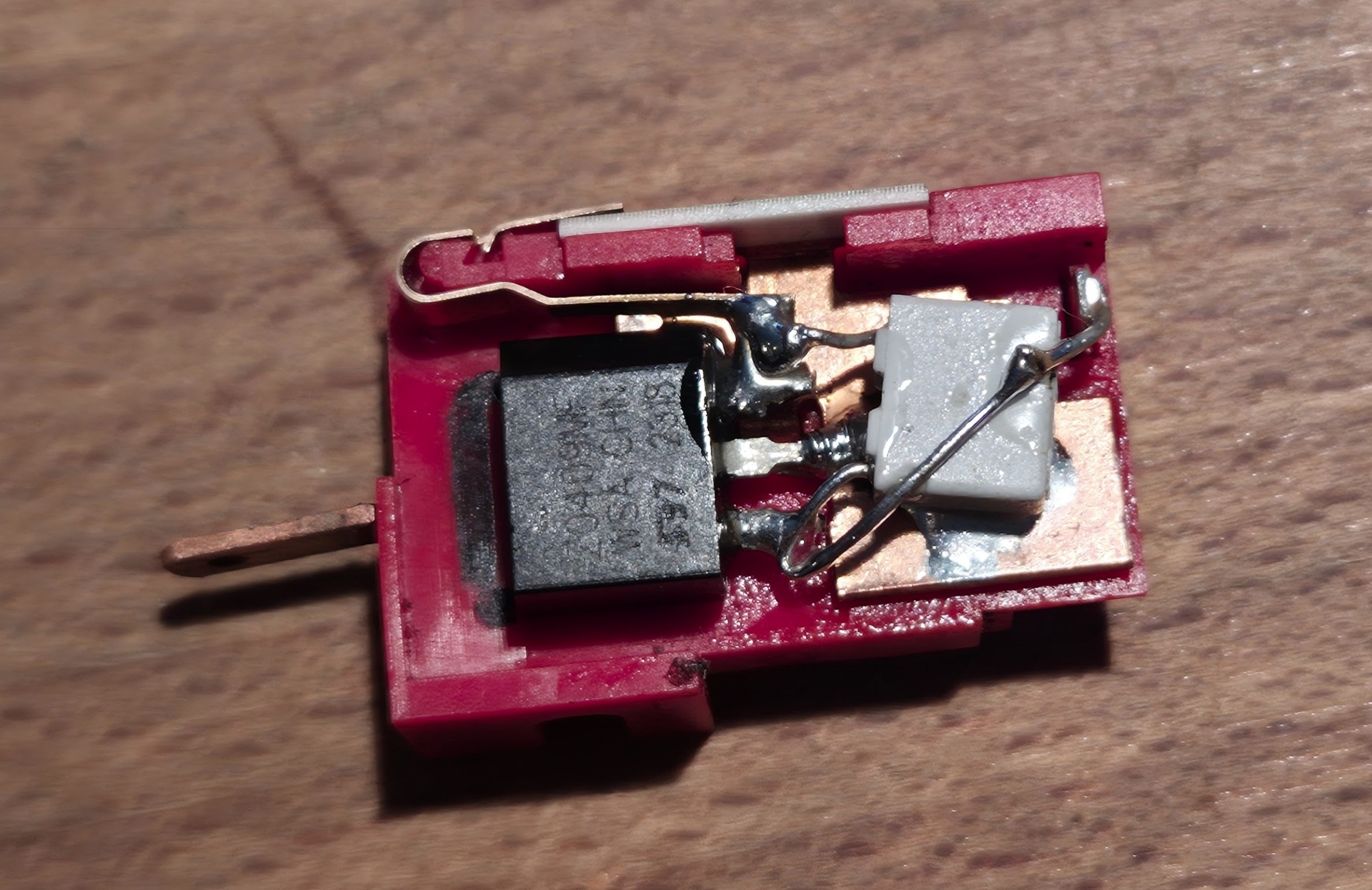 Megjöttek az alkatrészek. Szétszedtem a kapcsolót, kicseréltem benne a triakot és a kondit is. Csatolva a "mestermű". Inkább nevezném taknyolásnak, mint forrasztásnak, de az eredeti nagyonszép gyári verzióhoz képest ez most MŰKÖDIK. Semmi gömbvillám, szép sárga apró szikrák vannak, pont amennyi kell. Tehát az utókor kedvéért: a Z0409MF TO-202-es triak megoldotta a problémát. Annyi kiegészítés, hogy tulajdonképpen nem három alkatrész (triak, potméter, kondi) van az áramkörben, hanem van még egy nagyon sunyi 5k-s ellenállás is, jól elrejtve a szénkefe tartóban. Annak nem volt baja, de azért azt is kicseréltem. Tehát az áramkör a Régi motoros úr által belinkelthez hasonló (mínusz a diak, az bizony nincs). Mindenkinek nagyon köszi a segítséget, aki egy kicsit is gondolkodott a megoldáson! Üdv. SE 5104/1.0X4.0/6H3.5 De mi is ez?Sziasztok. A mai nap találtam de fogalmam sincs milyen alkatrész ill. mire használható. Valaki felismeri? A jelölés rajta: SE 5104/1.0X4.0/6H3.5.