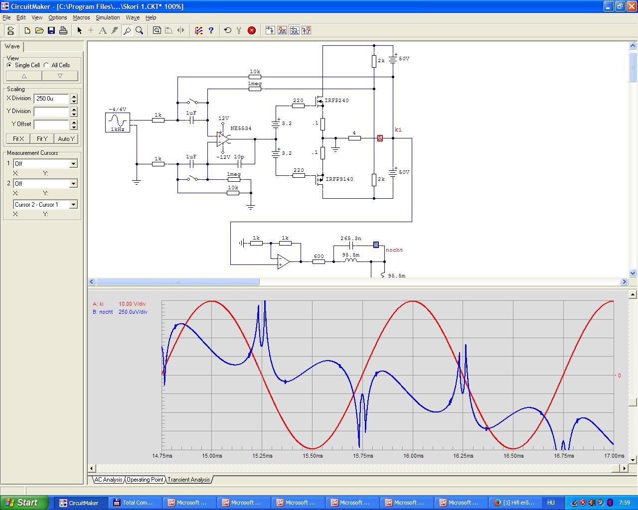 Idézet: „Mert így nem lesz olyan szempontból univerzális, hogy beköthető-e a trafó középkivezetése. Ugyanis ha ilyenkor bekötöm a trafó közepét, akkor a draineken levő két ellenállás közös pontján meg fog jelenni egy 100Hz-es komponens” Erről írtam egy kisregényt legutóbb. A trafó középkivezetését soros ellenállással is be lehet kötni és akkor nem jelenik meg a brumm. Ha nincs bekötve nem kell hangszóróvédelem, mert meghibásodás esetén nem tud DC áram folyni a terhelésre. A jól megválasztott értékű ellenállás a középmegcsapolásban szintén megvédi a hangszórót a leégéstől. A csatolókondik nagyon rossz hatással vannak a hangképre a gyakorlatban is. Ha ezt a szimulátor is mutatja, nyugodtan hidd el neki. Ha az a két tranzisztoros kiegyenlítő áramkör a legegyszerűbb és leghatásosabb megoldás akkor miért ne használhatnátok?