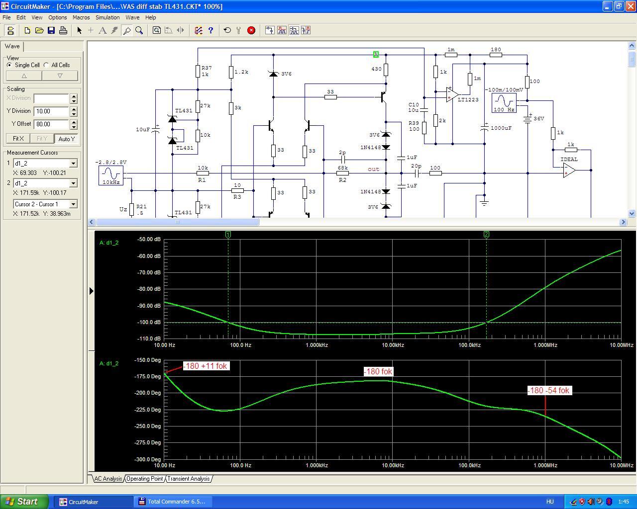 Nem fosztottam meg a nagy hurokerősítés jelentette előnyöktől. Van egy rendkívül stabil DC csatolású VAS fokozatom 44dB-es hurokerősítéssel 0.0001% torzítással, 10MHz-es egységerősítési frekvenciával, 90 fokos fázistartalékkal, ami mindössze 6 tranzisztort tartalmaz. Ezt terheli 200 MOhm/20pF impedanciával a buffer, aminek szintén van 70dB-es hurokerősítése, 85 fok fázistartaléka, 50ns késleltetése, 5mOhm kimeneti ellenállása 1kHz-en.