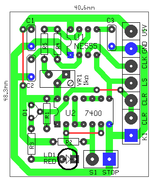 Ha a K1-et átváltod, akkor nullázza és nullán tartja a számlálót és a léptetőimpulzusokat nem engedi a számlánc bemenetére. A K2 alaphelyzetben húzza a relét, az pedig az ÉS kapun keresztül. beengedi a léptető jeleket. Ha megnyomod/átkapcsolod, a relé elejtésével, letiltja a léptető jeleket, míg a kapcsoló záró érintkezője a Latch Strobe bemenetet vezérli. "Alacsony érték esetén a reteszekben lévő adatok követik a számlálóban lévő adatokat. Magas érték esetén a reteszekben lévő adatok állandóak, és a számláló függetlenül is működhet." Csak itt, megnyomott helyzetben magas-szintet ad a nyomógomb, megnyomva meg szakadást, ami TTL-nél azonosan H szintet jelent. Tehát mind két esetben követi a Latch a számlálók jelét. Tehát nem sok értelmét látom. (A belső Latch Pld. arra való, hogy a kijelzés ne fusson együtt a számlálóval. Pld. a freki mérés alatt.) A relénél a DIP tokot úgy számozzák, mint ha egy normál 14 lábú tok lenne. Az átkötések pedig azért vannak, hogy másik típushoz is alkalmas legyen a kapcsolás. Lásd a képet..