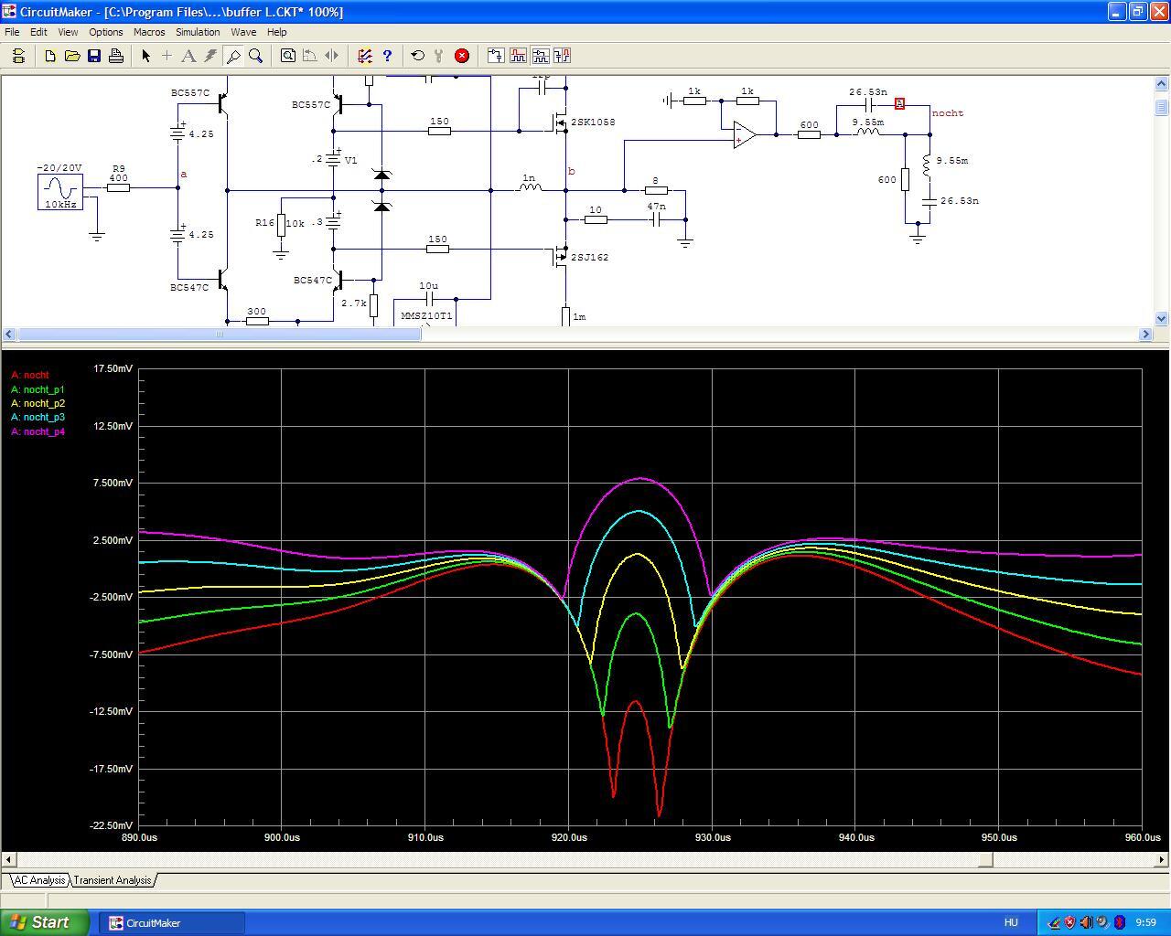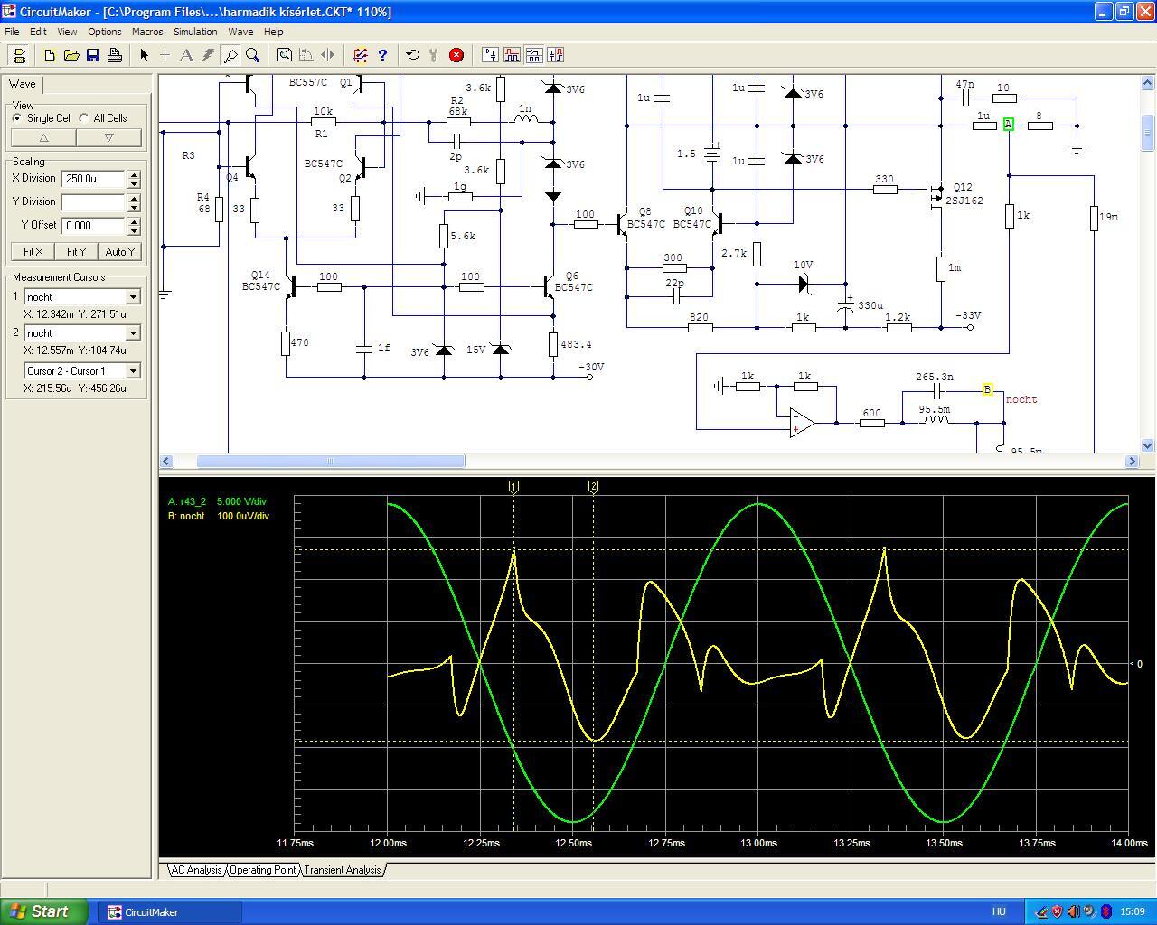 Tudok olyat szimulálni, mint amit Douglas Self mért: a keresztezési torzítás változását a nyugalmi áram függvényében. Ez csak mint érdekesség, de még jó lehet valamire. Ennél érdekesebb amit játszás közben észrevettem. Ha leterhelem rezisztíven a fetgörbítőt R16-tal nyilvánvaló. hogy változik (csökken) a hurokerősítés és ezzel együtt magasabb frekvenciák felé mozdul a domináns pólus. Ez eddig rendben van, senkit nem ért váratlanul. De! Miközben a hurokerősítés 70dB-ről 34dB-re csökken, a keresztezési torzítás mit sem változik. Ez normális? Igen. Mert már írtam, hogy a torzítás a jelkésleltetés függvénye. Nem árt ezeket a dolgokat megjegyezni.