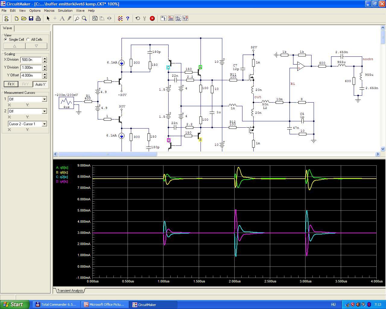 Négyszögjel-átvitelnél a VAS szépen "elsimogatja" a buffer túllövését, azaz korlátozza a jelemelkedési sebességet kb. 10V/us-re, de ott vannak a FET meghajtás hibái a kollektor áramokban. Valami jobbat kellene kitalálni ennél...