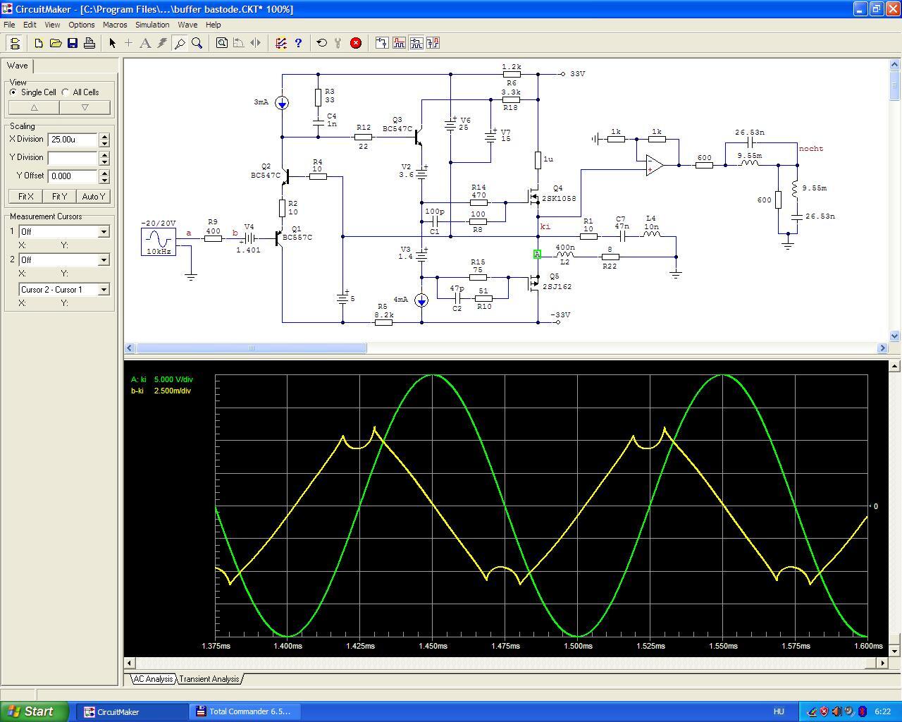 Továbbra is buffer. Igazolódni látszik az elméletem, de még más kapcsolásokat szimulálni fogok ellenőrzésképpen. Abban az ötször egymás utáni hsz sorozatomban azt állítottam, hogy a torzítás csökkentésében nagyobb szerepe van a sebességnek (a késleltetésnek), mint a visszacsatolási tényezőnek.