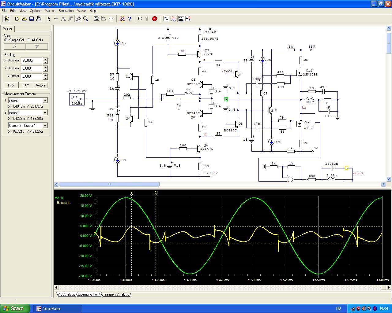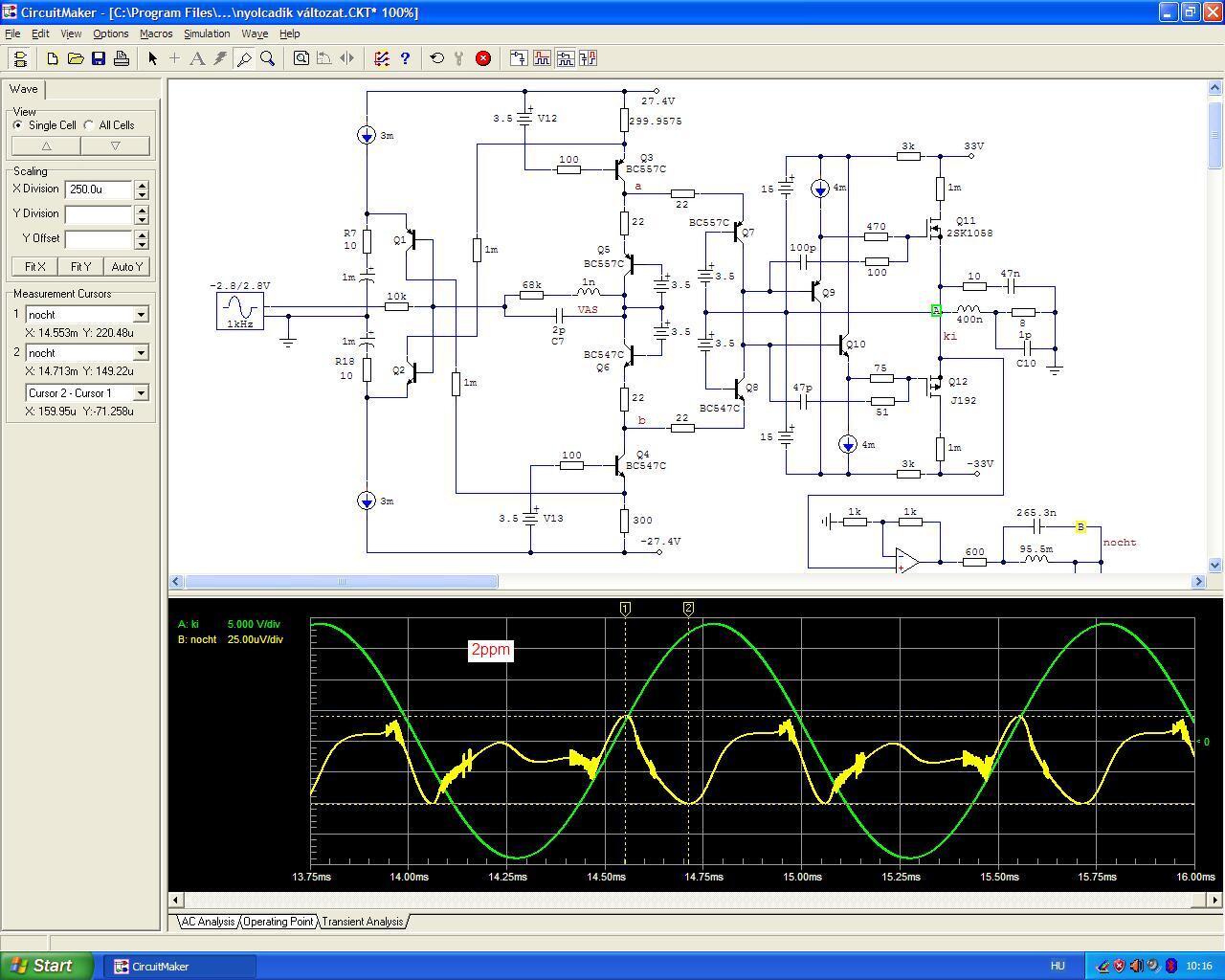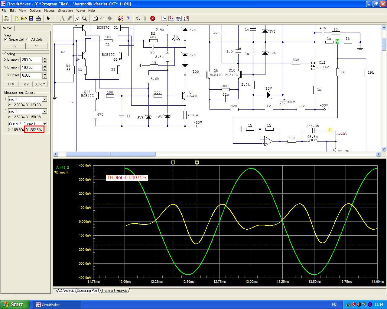 Tudok olyat szimulálni, mint amit Douglas Self mért: a keresztezési torzítás változását a nyugalmi áram függvényében. Ez csak mint érdekesség, de még jó lehet valamire. Ennél érdekesebb amit játszás közben észrevettem. Ha leterhelem rezisztíven a fetgörbítőt R16-tal nyilvánvaló. hogy változik (csökken) a hurokerősítés és ezzel együtt magasabb frekvenciák felé mozdul a domináns pólus. Ez eddig rendben van, senkit nem ért váratlanul. De! Miközben a hurokerősítés 70dB-ről 34dB-re csökken, a keresztezési torzítás mit sem változik. Ez normális? Igen. Mert már írtam, hogy a torzítás a jelkésleltetés függvénye. Nem árt ezeket a dolgokat megjegyezni.