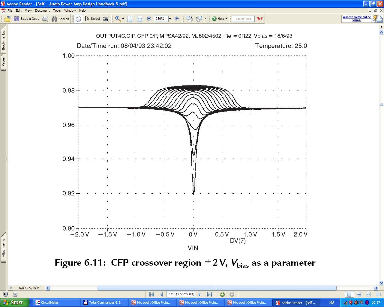 Idézet: „Te amúgy szívbaj nélkül csinálsz tized százalék alatti torzítású erősítőt, azaz 10A csúcsáramnál 10 mA javító áram elég.” De ennek a 10mA hibaáramnak a terhelésen kell átfolynia, azaz ott kell kioltani a torzítást. Ha terhelés 8R, a kimeneti ellenállás 0.1R, akkor 81-szeres áramnak kell folynia a hibajavító áramkörön: tehát 810 mA-nek.
