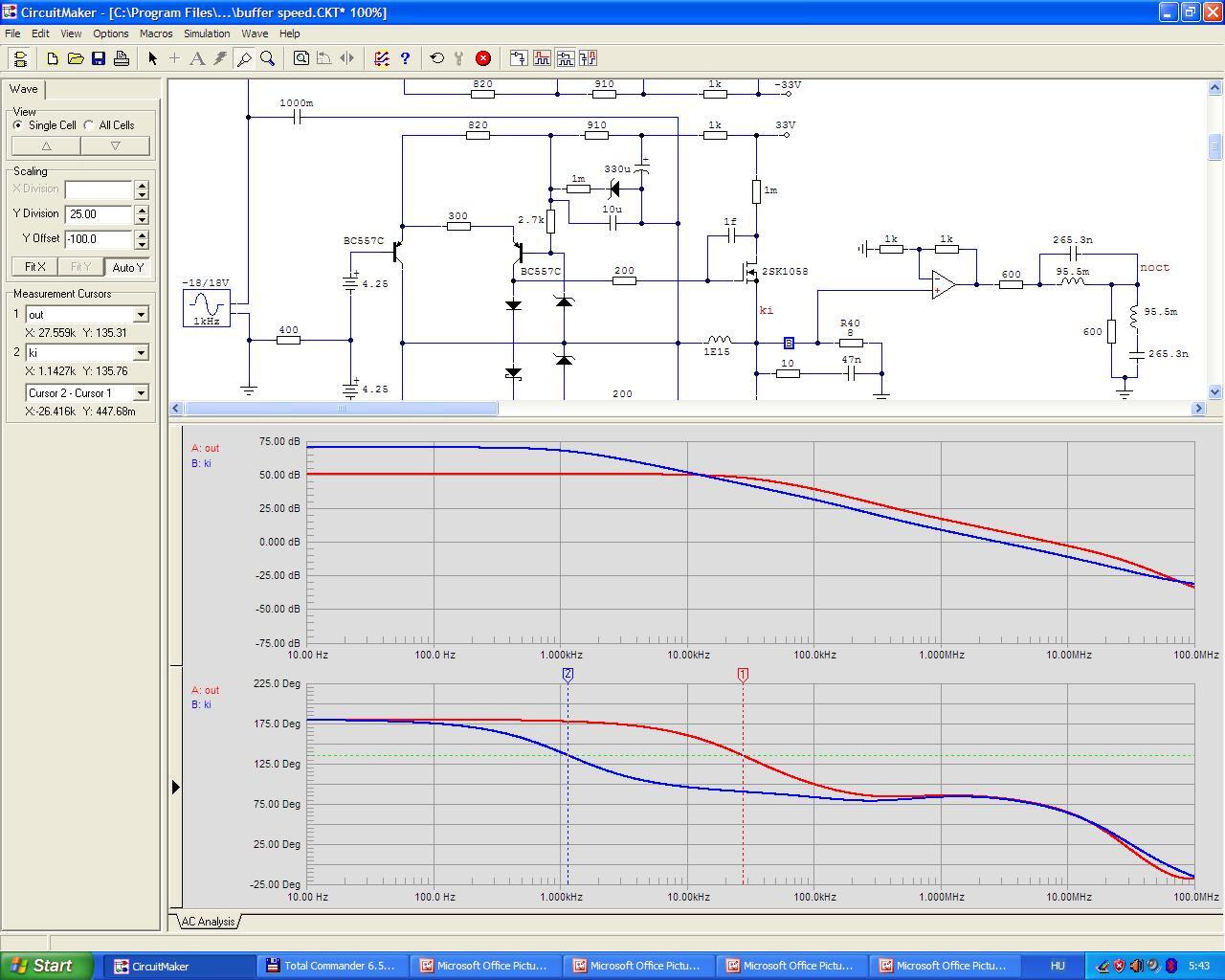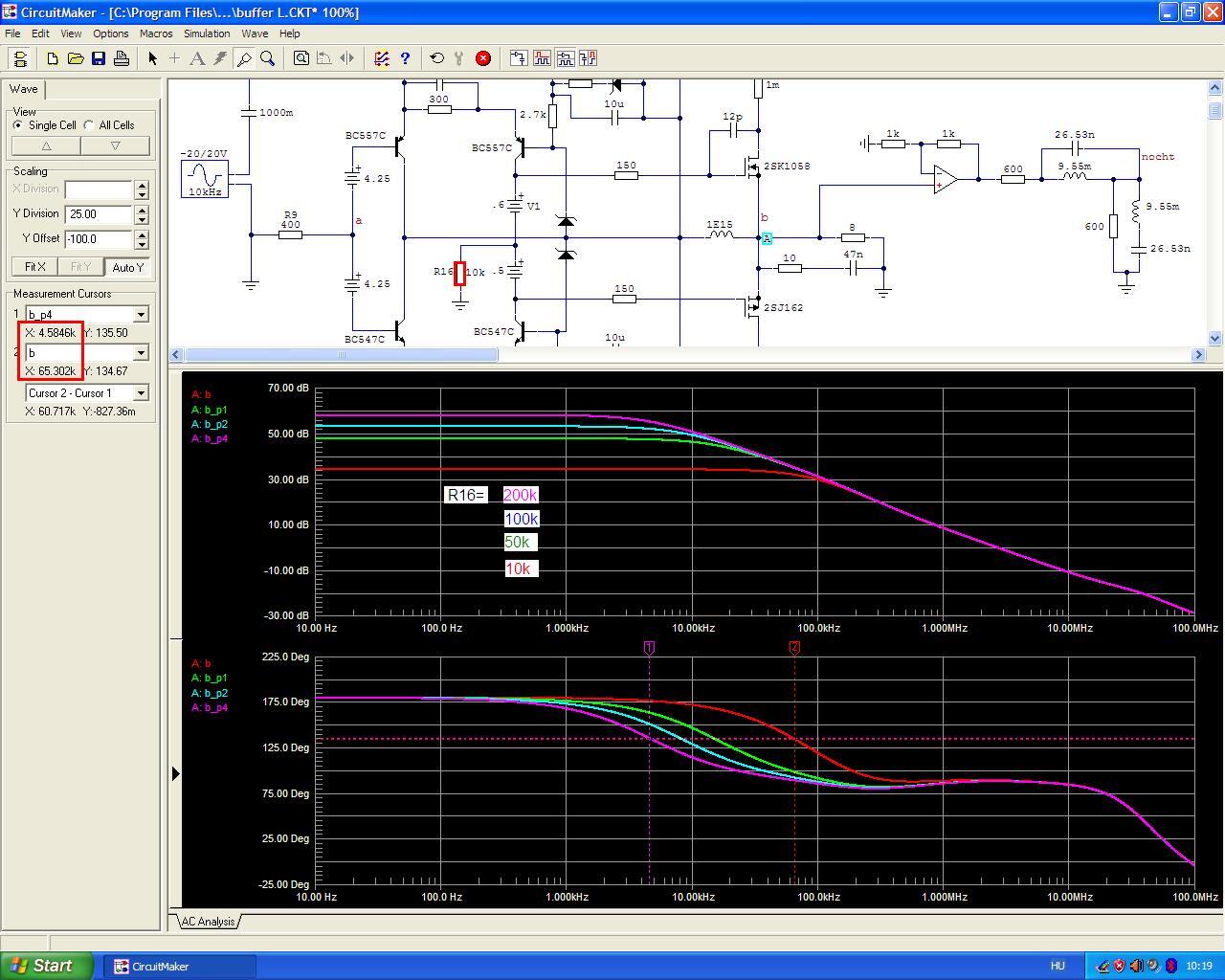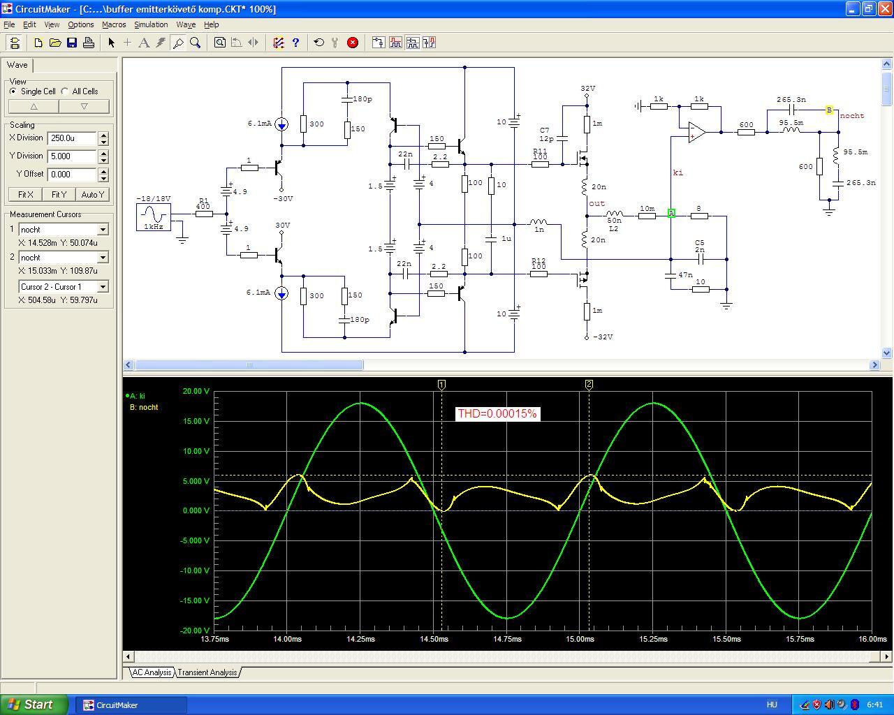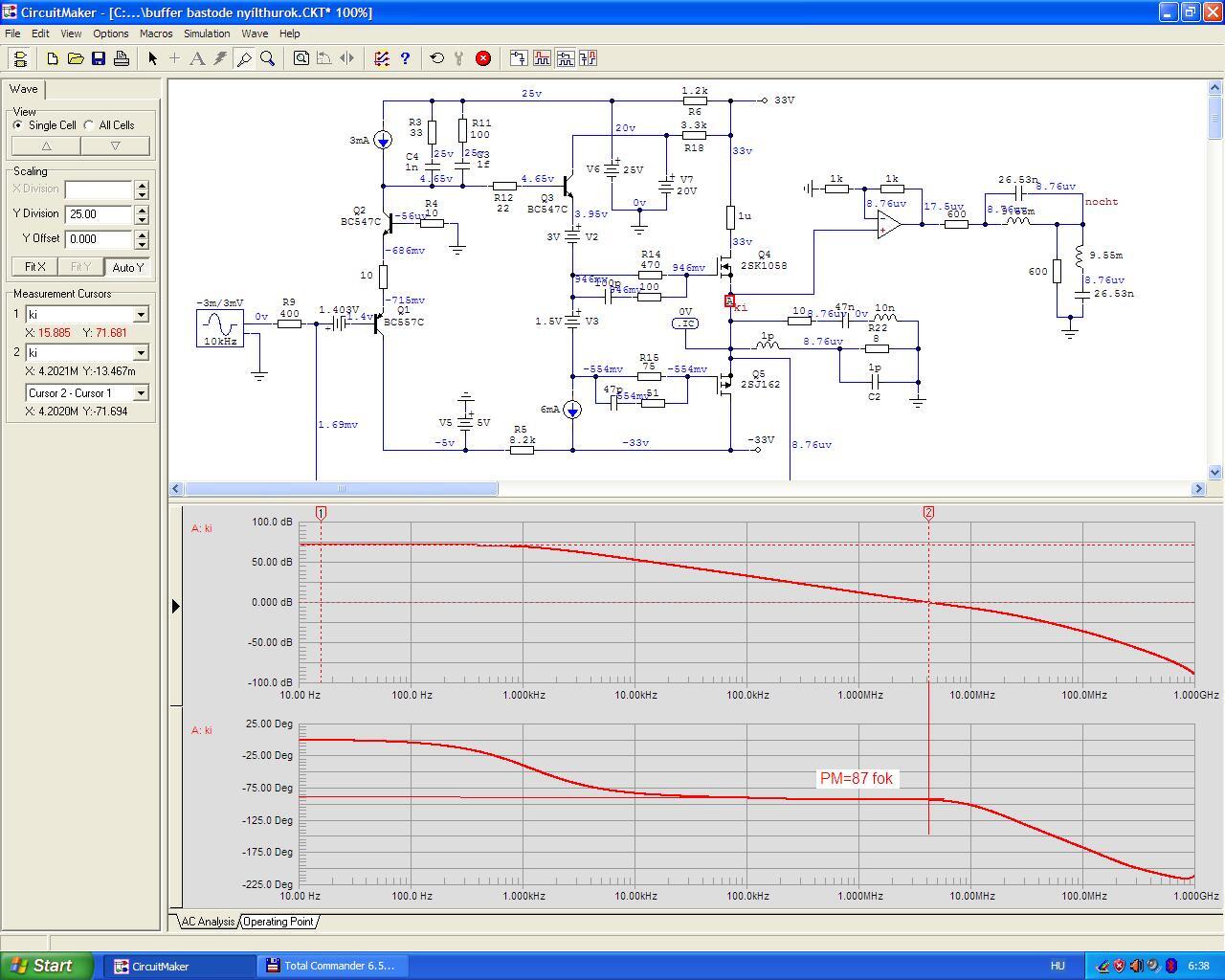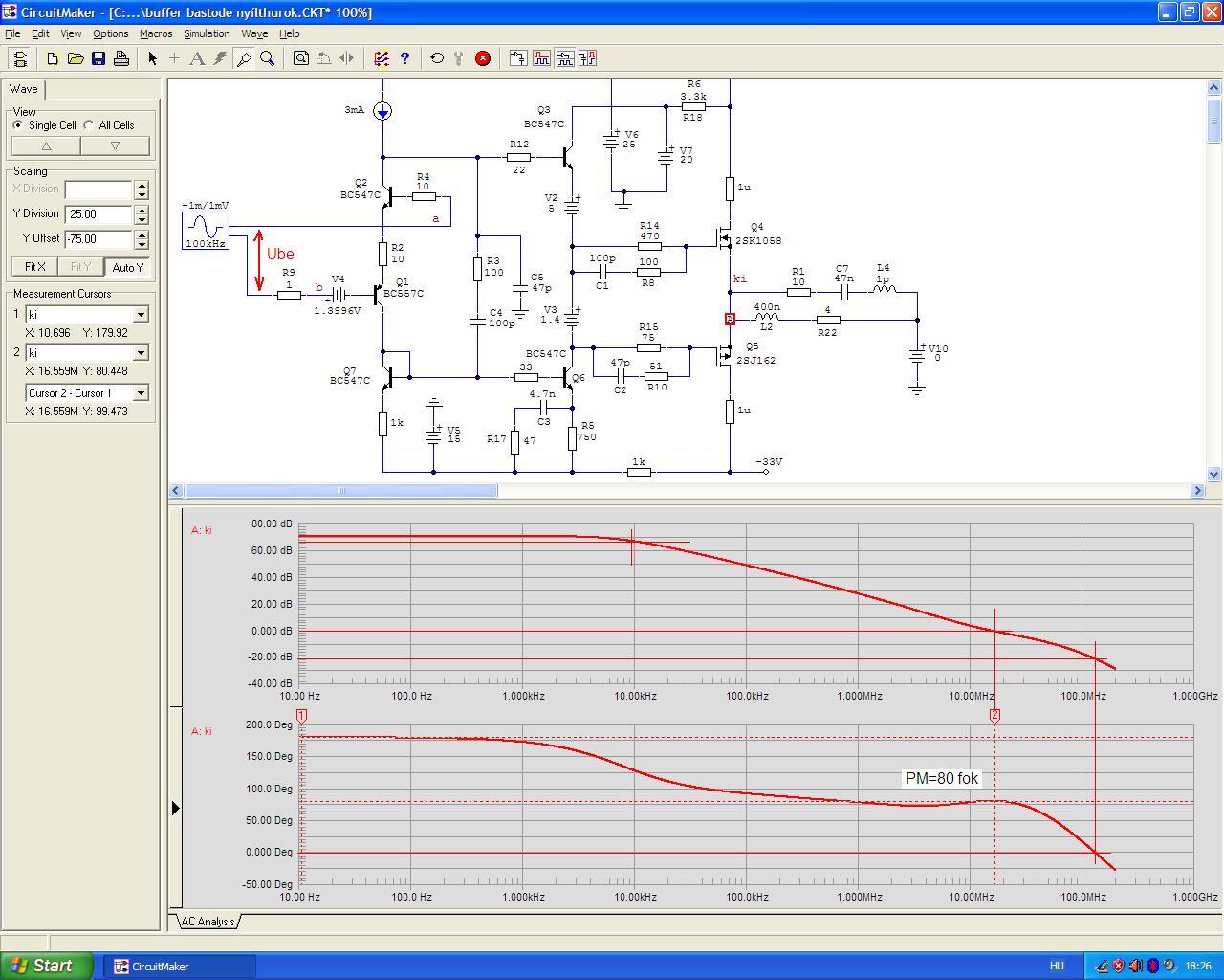 - A THD 1 kHz-en 0.0002% és nincs keresztezési torzítás. Arra az "U" betűre gondolok. - 10 kHz-en 0.001% és látszik, hogy a VAS-t terheli be a buffer, emiatt van. - a buffer futási ideje... gyakorlatilag nincs késleltetése - buffer nyílthurkú erősítés... másodfokú rendszer előrecsatolással. Nem tud gerjedni, mert a fázistolás (eméletileg) soha nem éri el a -180 fokot. - Kapacitív terhelésre is stabil marad, a fázistartalék nem változik... (most még gyengécske az 45 fok...)