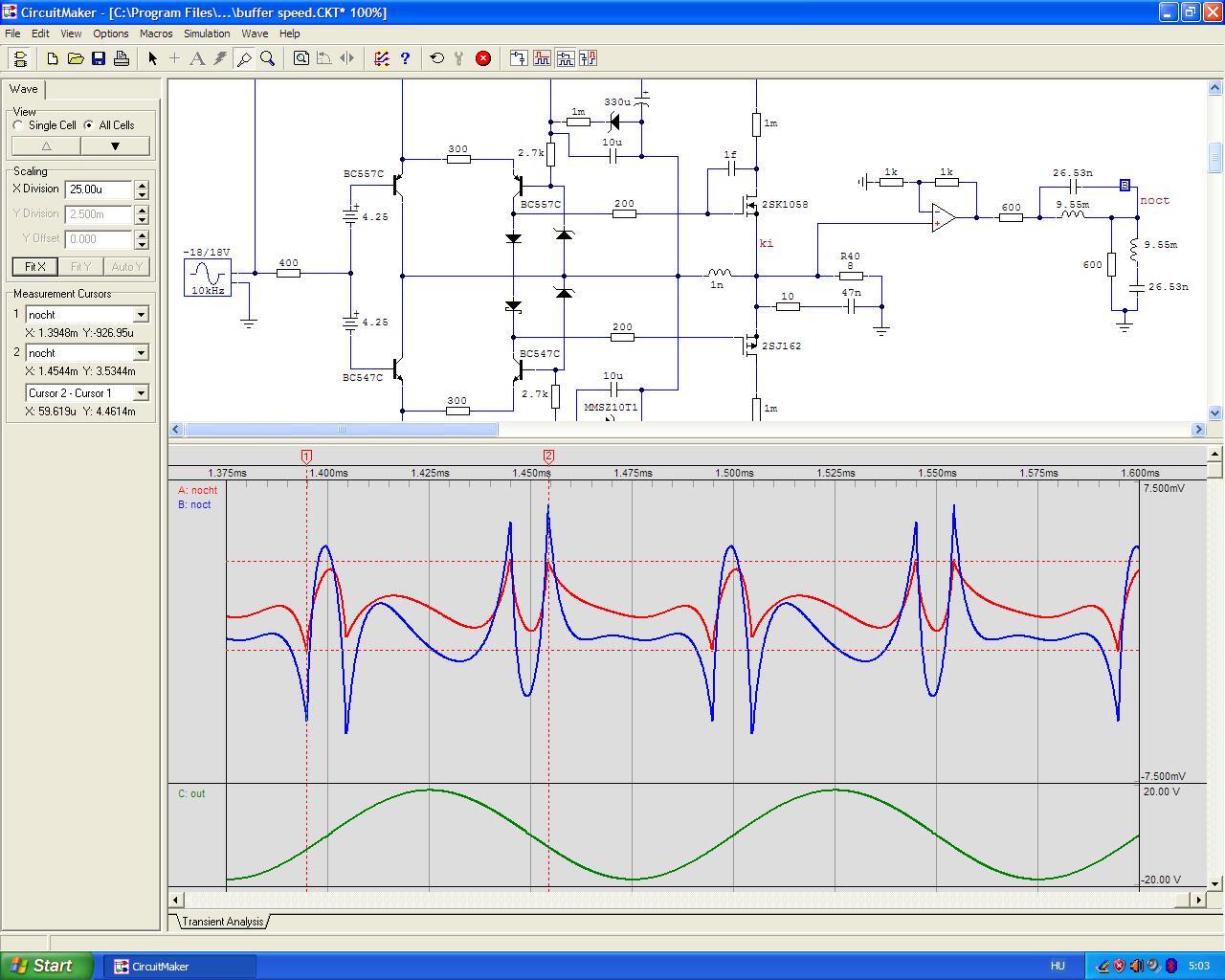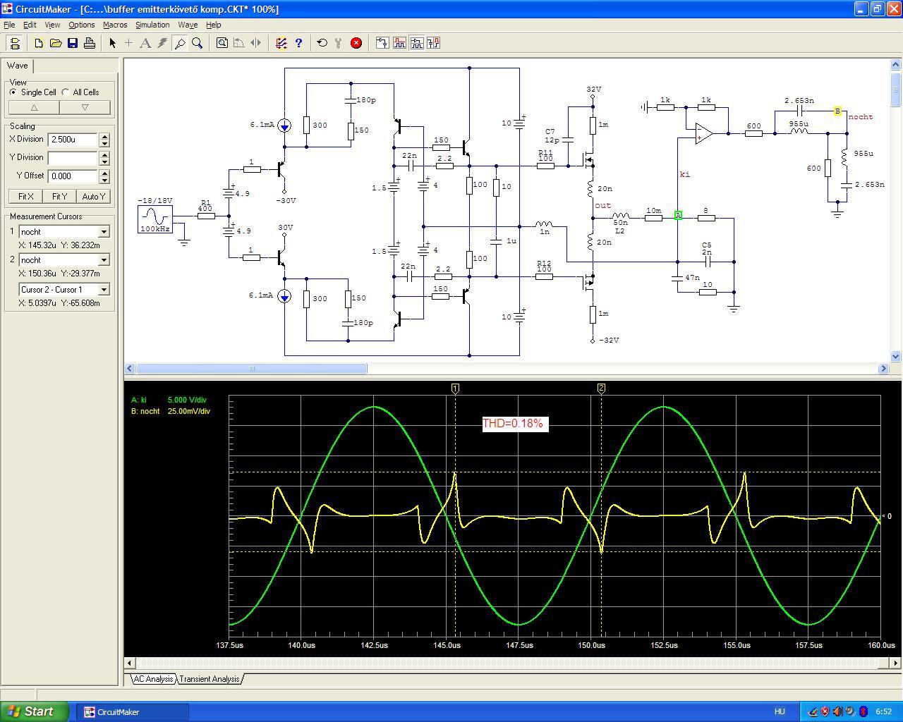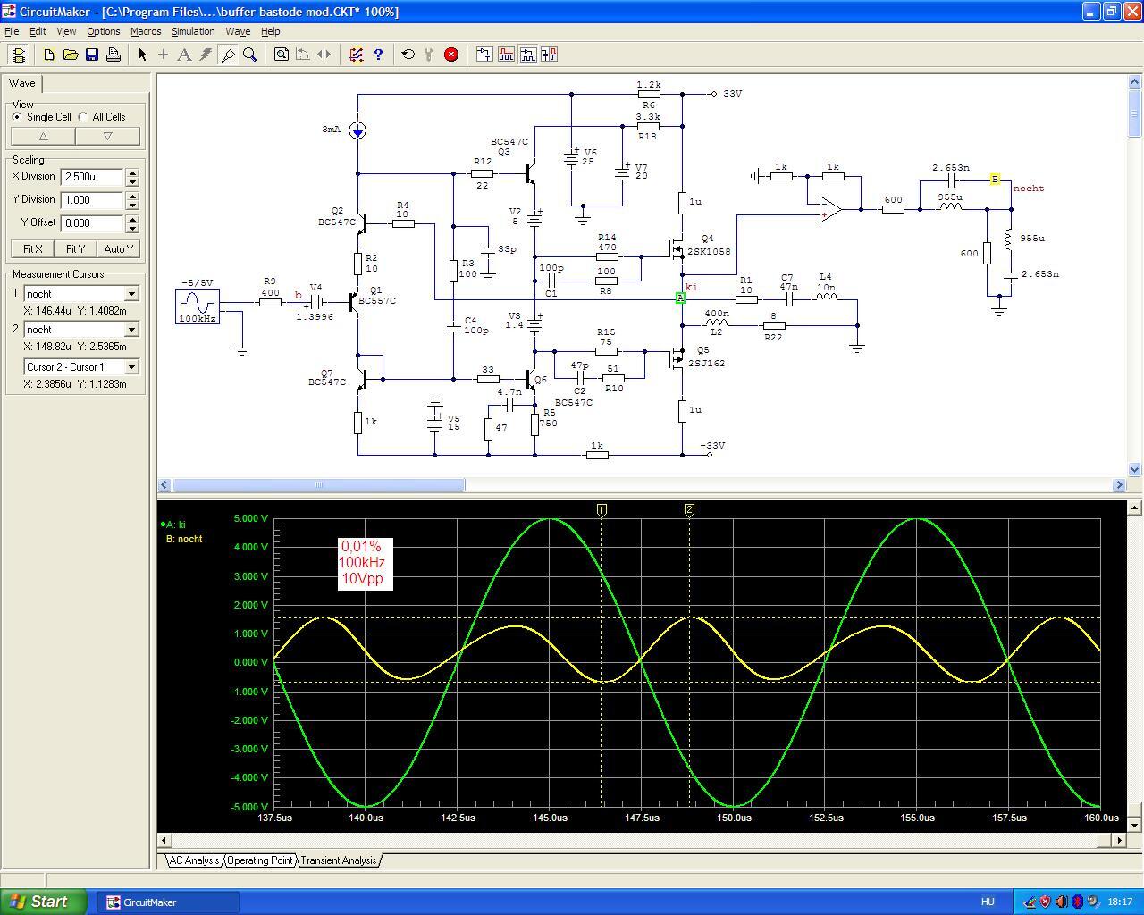 Továbbra is buffer. Igazolódni látszik az elméletem, de még más kapcsolásokat szimulálni fogok ellenőrzésképpen. Abban az ötször egymás utáni hsz sorozatomban azt állítottam, hogy a torzítás csökkentésében nagyobb szerepe van a sebességnek (a késleltetésnek), mint a visszacsatolási tényezőnek.