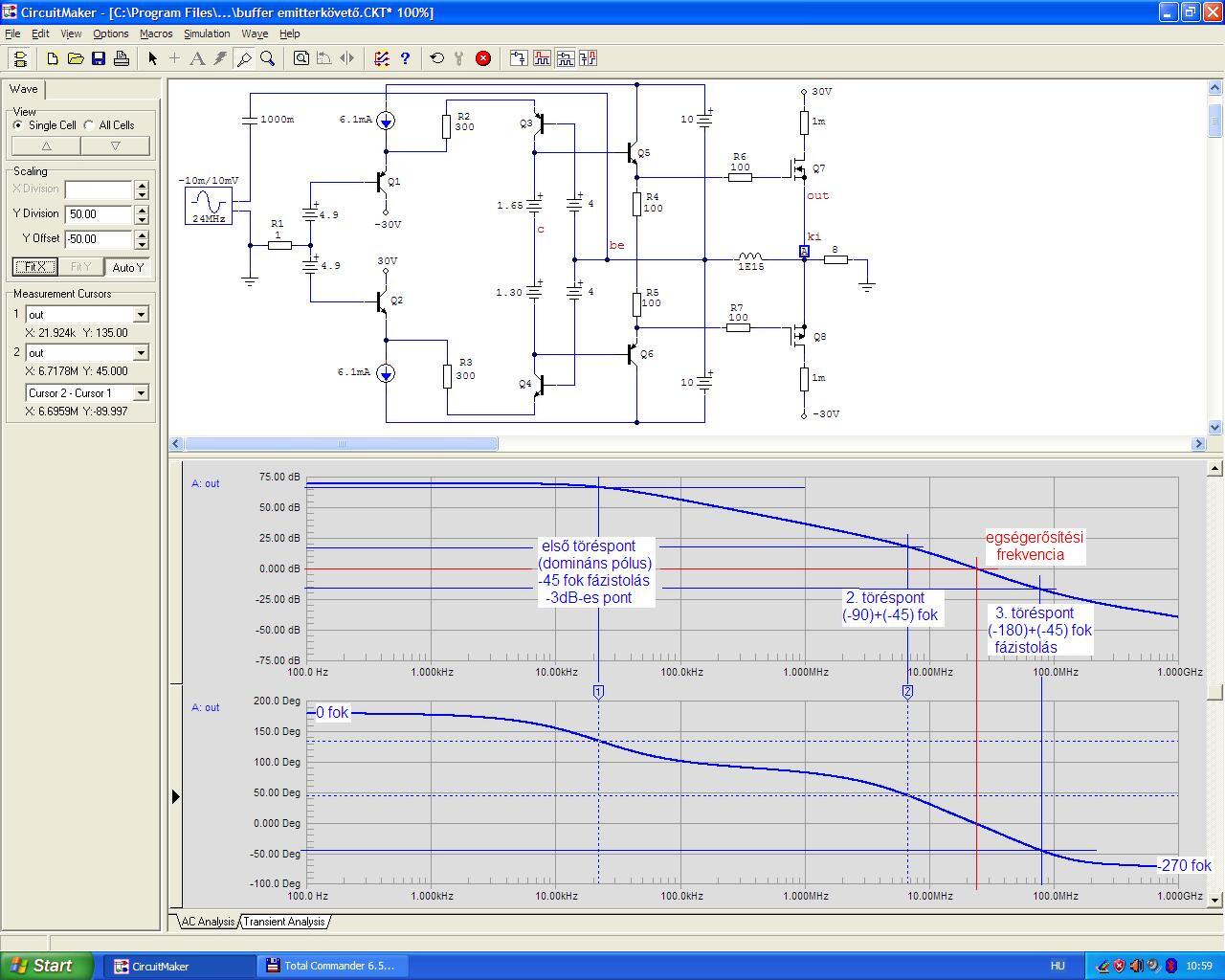 Ha gyorsabbá akarom tenni a FET meghajtást, muszáj betenni elé egy emitterkövetőt. De így három pólusunk lesz. Elég szerencsétlenül jön ki minden, mert a domináns pólus frekvenciája feljebb tolódik 22 kHz-re. A FET bemeneti kapacitásai adottak, ennek a pólusa 5-10 MHz környékére esik és nem lehet ezzel mit kezdeni. Egy emitterkövető meg gyors (ezért kell bele tulajdonképpen), ez meg felmegy úgy 80 MHz-re. A fázistartalék pont nulla fok lesz, tehát gerjedni fog. ("b törésponti frekvenciák" Bode).