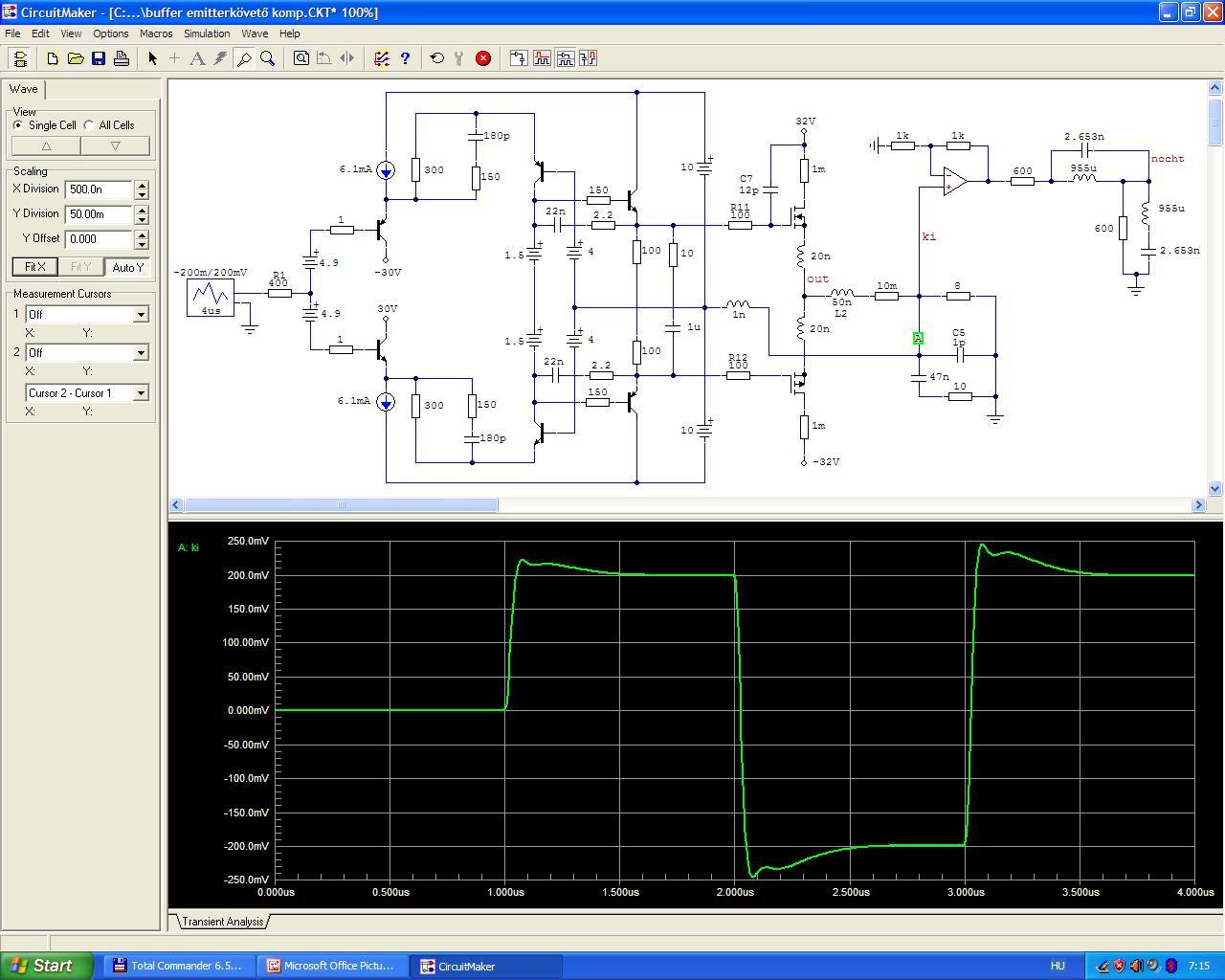 Négyszögjel-átvitelnél a VAS szépen "elsimogatja" a buffer túllövését, azaz korlátozza a jelemelkedési sebességet kb. 10V/us-re, de ott vannak a FET meghajtás hibái a kollektor áramokban. Valami jobbat kellene kitalálni ennél...