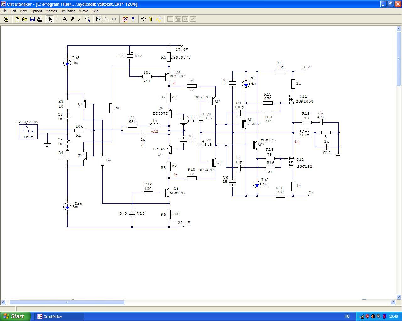 Ha kicsit átforgatom benne a tranzisztorokat ugyanúgy megmaradnak ezek a fokozatok, de kevesebb feszültségreferencia kell hozzá és könnyebb (jól) kompenzálni. Nem elhanyagolható szempont, hogy automatikusan beállnak a munkapontok. De még nekem is emésztenem kell kicsit ezt a kapcsolást, hogy mennyire lenne életképes.