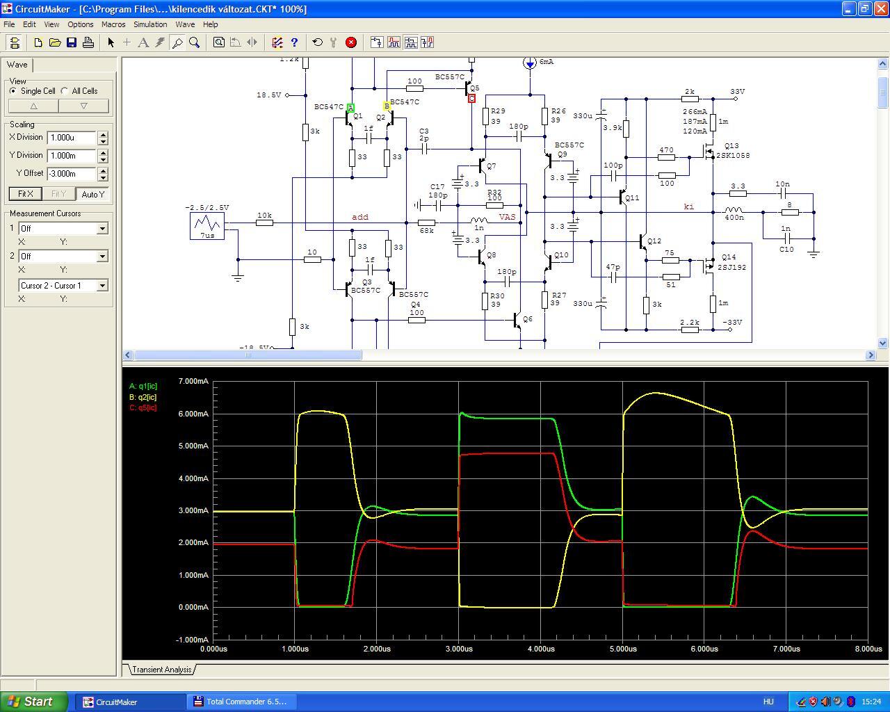 „Én is keresgélem a hibákat a kapcsolásodban, aztán van is benne néhány. Ez a legutóbbi driftes viszont nem annyira melléfogás, csak nem szabad levegőben lógatni a bemeneti tranzisztorok emittereit.”