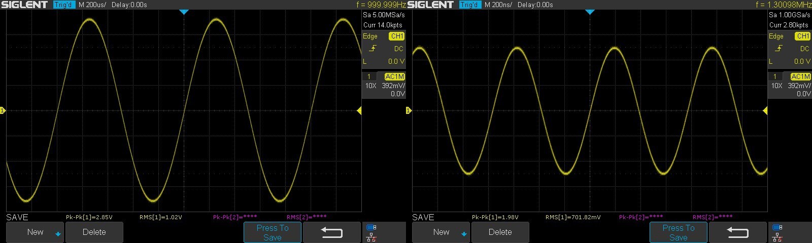 Azért lett felületszerelt, mondom így könnyebb benne turkálni, egy egy alkatrészlábat kibillenteni stb., de nem volt jó ötlet, meg kellett küzdeni az utolsó néhány alkatrész beforrasztásával.Az elején indulni se akart, mert hiába néztem át négyszer, csak sikerült az áramgenya tranyóját fordítva beültetni. - Tranyós bemeneti fokozattal is működik, azzal felmegy 1,3MHz-ig a -3dB-es pont, fetekkel csak 1MHz-ig, de a tranyós bemenet megmakacsolta magát, akármit csináltam vele, ha levettem a bemenetről a generátort aminek a kimenete elvileg 50Ω mindig elbillent a végfok a negatív táp felé, akkor is ha tettem be elkót az nvcs-be. Hiába próbáltam kinullázni sehogy se akart jó lenni. Fetekkel nem csinálja ezt, műxik ahogy kell. Mérek majd rajta tortyintást is nemsokára. Tettem egy hangszórót a kimenetre, a hallható zaja nulla, legalábbis a labortáp zúgó ventilátorai mellett egy pisszenést se hallottam a hangszóróban. Kicsit alul van kompenzálva gyárilag mert túllövéses a néccöge, bár a generátoré is szerintem de majd megnézem. Nagyjából azt hozza amit a szimulátorban, de ezt a tranyós elbillegést ott nem csinálta.