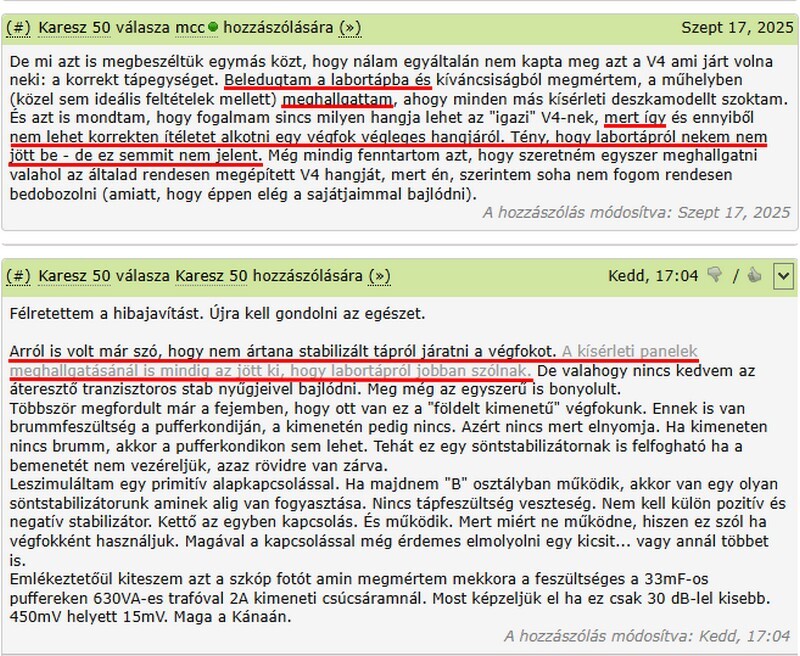 Van egy nagy toroidom, amin elférne kényelmesen mind a 4 tekercs, de ha már dual mono akkor tényleg legyen is az, ne legyenek nekem a szekunder tekercsek kapacitív csatolásban a két csatorna között. Eddigi erősítőimnél ez nem nagyon jött ki, de ezt is kipróbáltam közös tápról, és bizony ennél hallhatóan számít, szóval mindenképpen dual mono lesz. Skori: Nem olvasol figyelmesen. Jelenleg nincs semmiféle aszimmetria, mivel hiperszilekről járnak a végfokok. Az aszimmetria amit mutattam azt egy toroid két egymáson lévő tekercsén mértem. És akkor ott van még egy gond, majd az is megoldódik idővel, ami az erősítés. A végfok erősítése önmagában kicsi, azon a ponton (jelszinten), ahol a forrásomnak a legkisebb torzítása van, csak kb. 10W-ig tudja kihajtani. Gyárilag ugye van benne előfok, de az előfok és a végfok között meg van elkó, meg hangerőpoti. Egyiket sem szeretném a jelútba betenni, mert az 50%-nál jóval kevesebb esélyét (inkább nullához konvergálót) látom annak, hogy a hangzást ez a két alkatrész javítsa, vagy legalább ne rontsa. A másik verzió, hogy emelek kicsit a végfok erősítésén, de azzal meg annak paramétereit rontom. Valamelyik ujjamat viszont meg kell harapnom, majd meglátjuk. Csak ne unnám már borzalmasan ezt az örökös kísérletezést. A hozzászólás módosítva: Dec 21, 2025