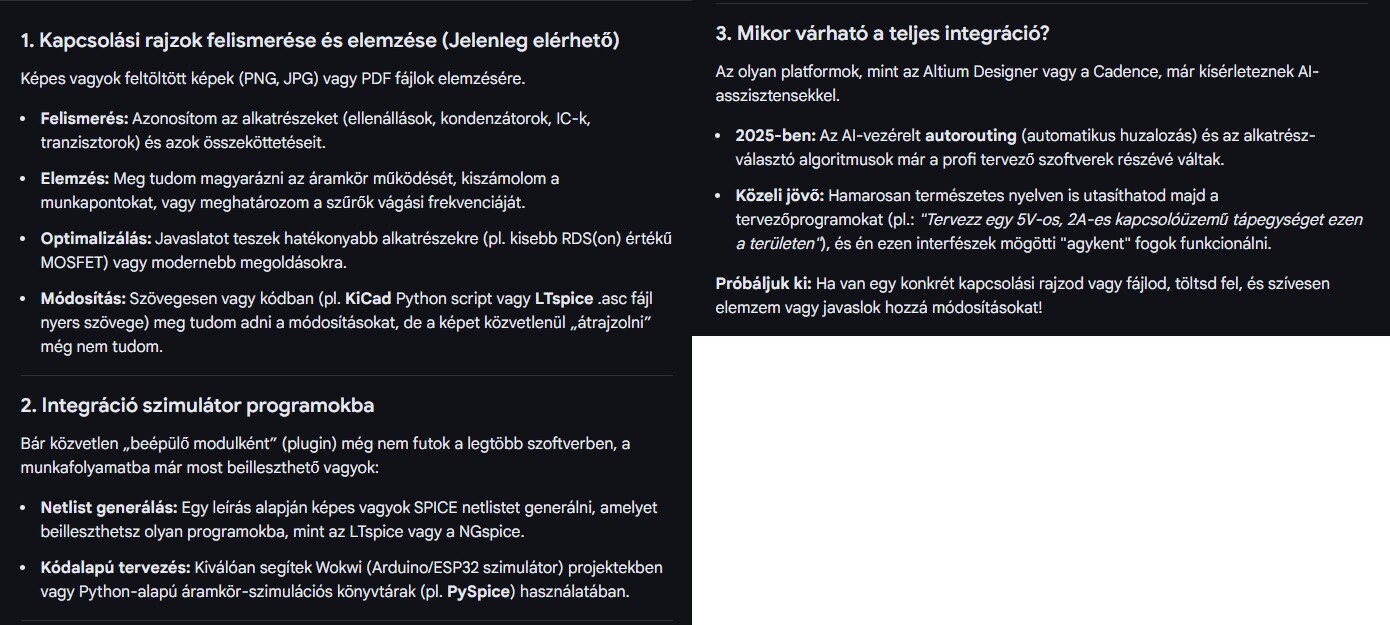 Ha az AI rendesen bele lesz már integrálva ezekbe a szimulátor szoftverekbe, határ a csillagos ég. Semmit nem kell csinálni, csak az elvárásokat kell majd meghatározni és ő hozzáfarigcsálja a kapcsolást. A tervezőmérnökök meg kenyér nélkül maradnak. A neten fellelhető infók alapján még azt is megmondja egy erősítőről (ami infóhoz csak hosszas keresgélés után jutnánk), afféle karbantartási vagy megelőző tanácsként, hogy mik a típushibái amikkel esetleg ennyi idő után javítani szokták stb.