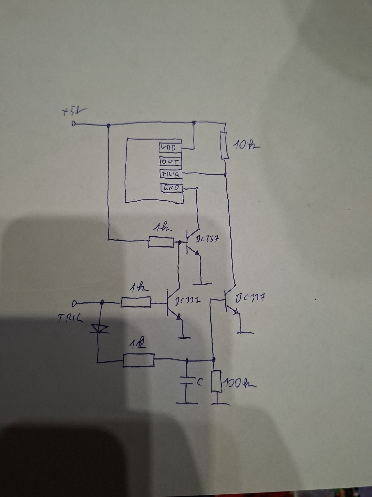 Az 555 trigger bemenetről egy bázis ellenálláson keresztül kap vezérlést a p-s, kondi kisütő tranzisztor. Az eredeti valami olyan szöveggel volt, hogy impulzus hosszabbítás 555-el. ... és tényleg azt csinálja. A hozzászólás módosítva: Nov 28, 2025