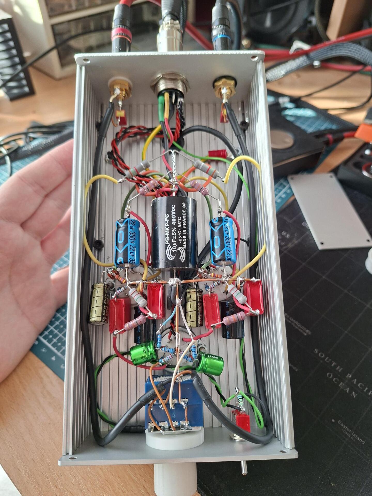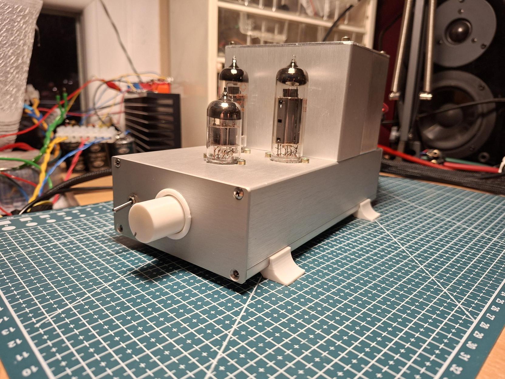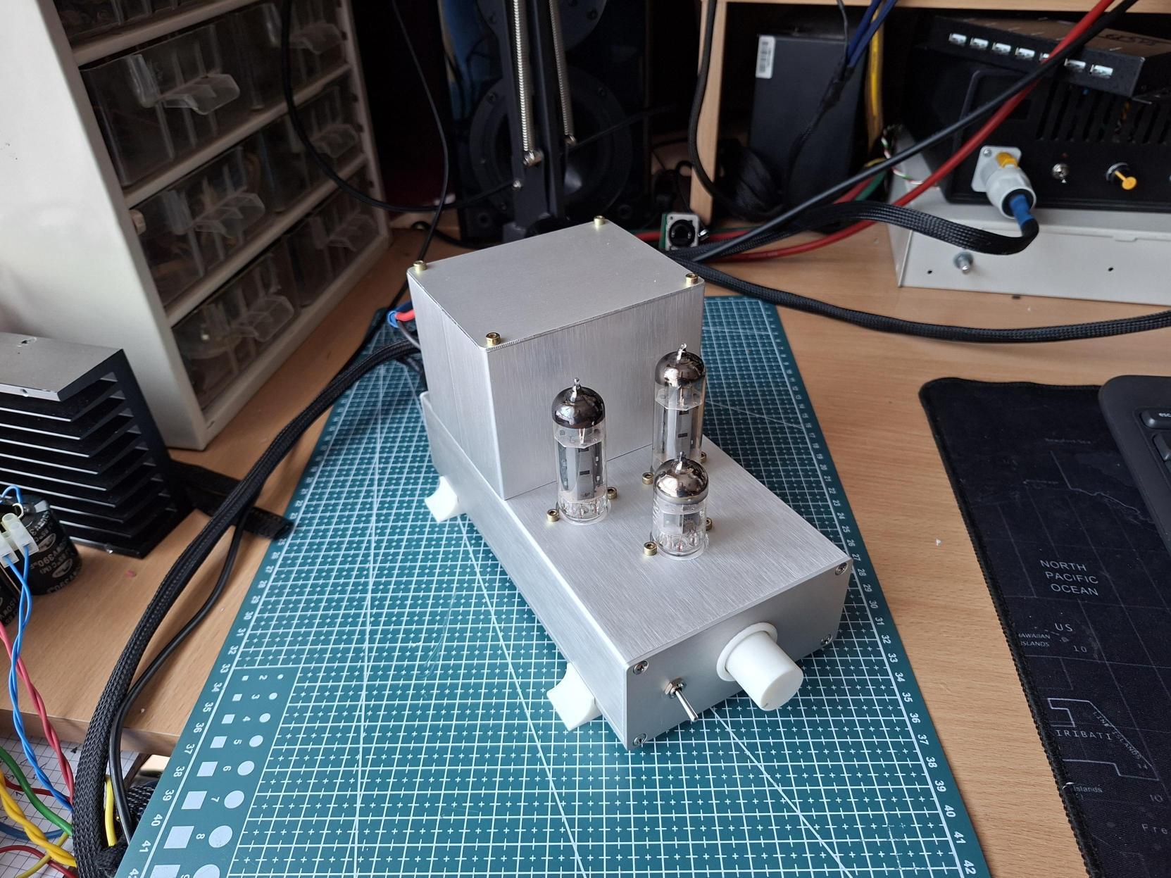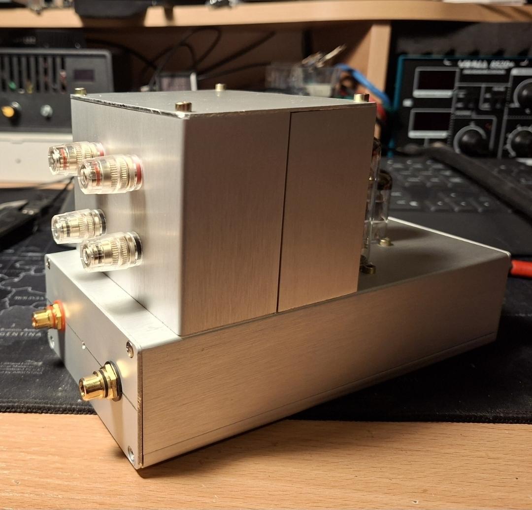 Összeraktam egy mini EL84 SE ( 2x3W ) erősítőt ajándéknak. A ház két kiselejtezett műszerdobozból áll, néhány 3D-nyomtatott kiegészítéssel. A kész méret: 200 × 105 × 130 mm.
