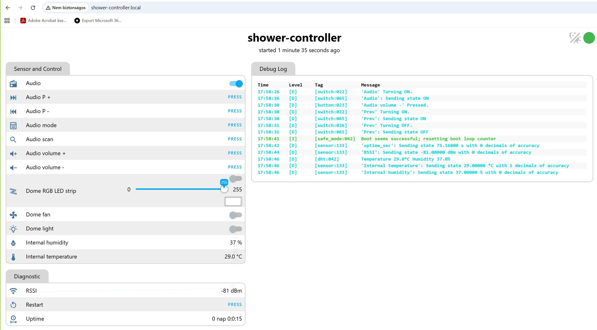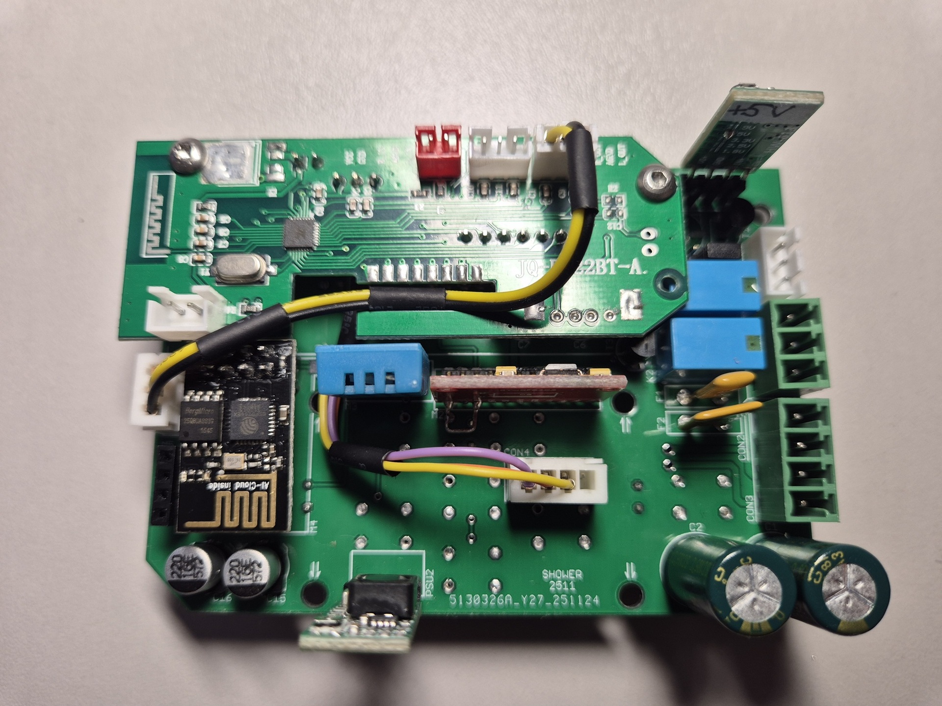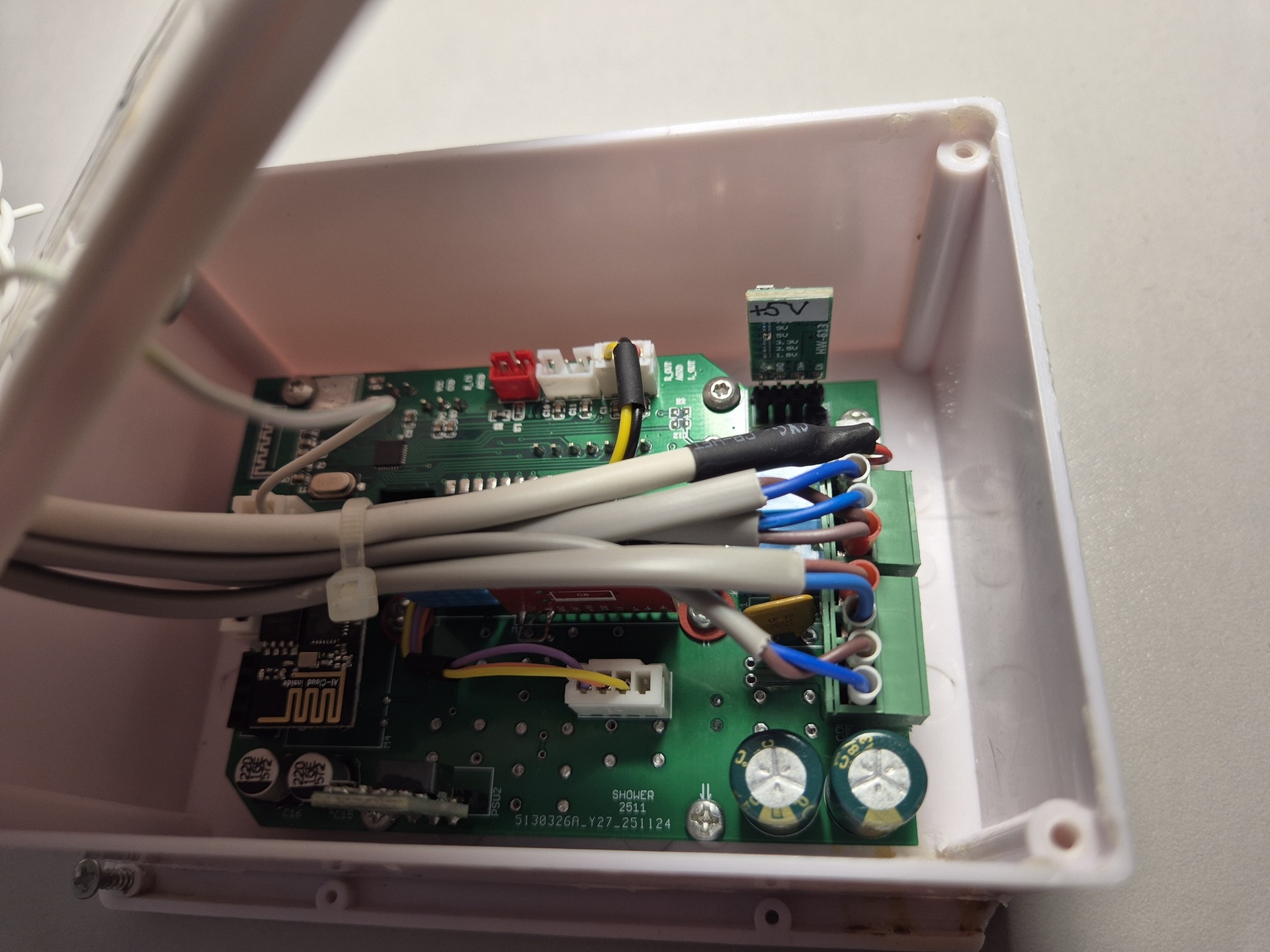 A rádiómodul, ventillátor, világítás és a WS28XX LED szalag vezérlést egy ESP8266-01 modul végzi, ezen Esphome fut, így Home Assistant alá is könnyen integrálható.