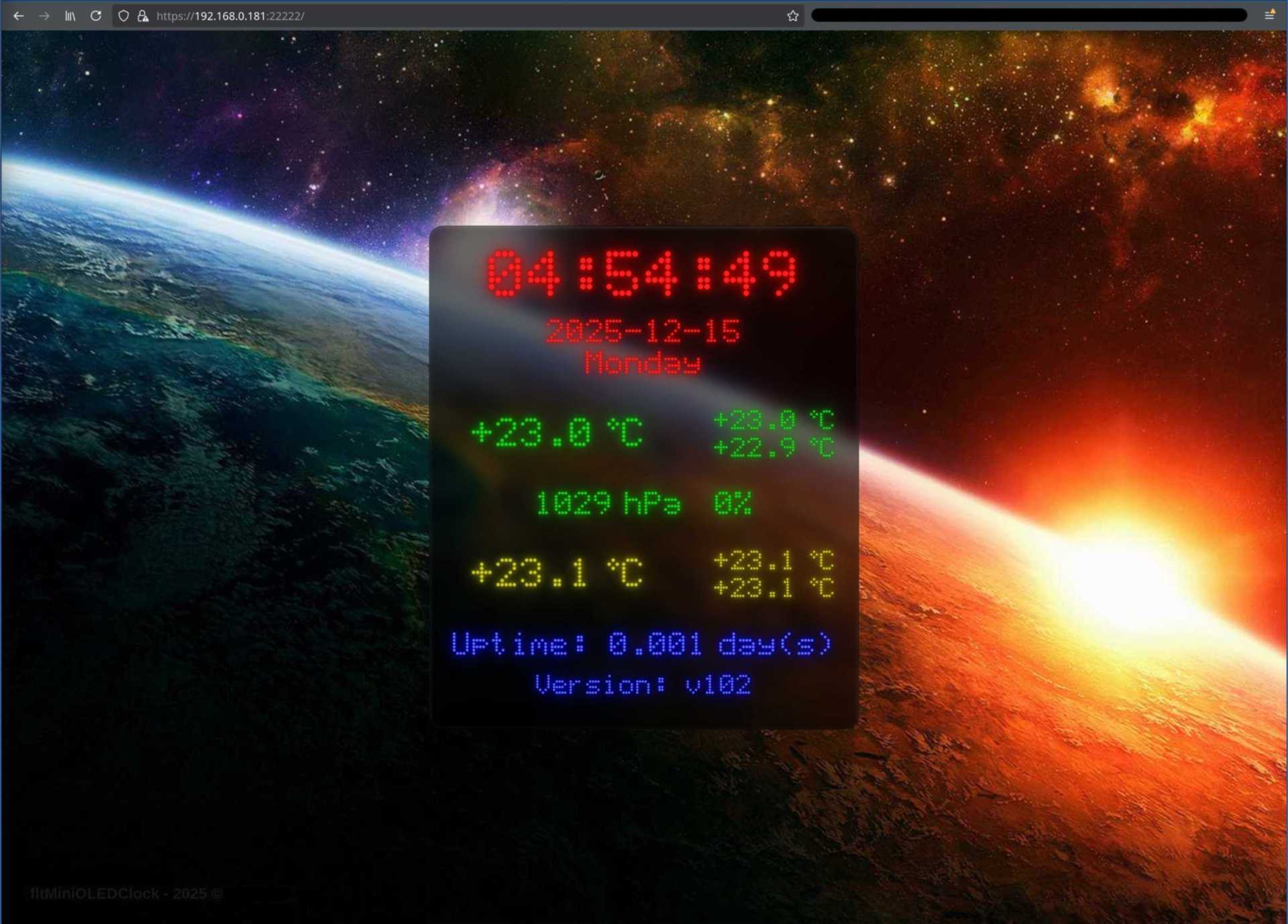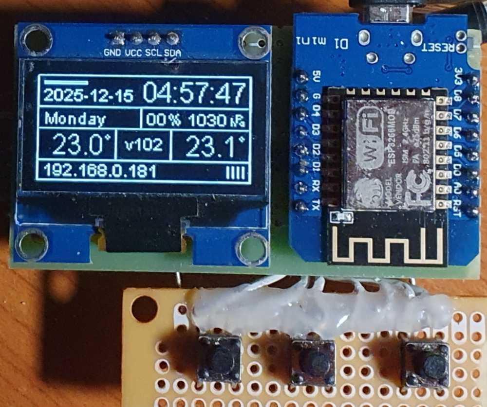 Itt egy változat tőlem is órára és szenzorokra (nem akartam újabb kérdést nyitni), valahogy így fog kinézni. Inkább csak percenkénti frissítésre van kitalálva, a másodpercek nem is lesznek kijelezve (kicsit elegánsabb is keskenyebben). Az éppen felhasznált ESP8266-on nincs túl sok látnivaló. Távolról lesz használva eltéve egy sarokba és a neve ellenére ez a project leginkább fagyveszélyt fog jelezni. A többi csak extra - a páratartalom-mérő még nincs is rajta. Mindent a Flash tartalmaz (így is bőven akad még hely); a háttérképet, a fontot (amibe bele kellett szerkeszteni a fokjelet...), a favicont, egy egyszerűbb html oldalt is a főoldalon kívül, de a memóriához már cipőkanál kell. Ennek ellenére stabil, akkor is, ha gyötröm. Rövid és hosszú gombnyomást is megkülönböztet bal, jobb és mindkét gombbal egyszerre. : -) A harmadik a Reset. Néhány parancsa soros vonalon is van.