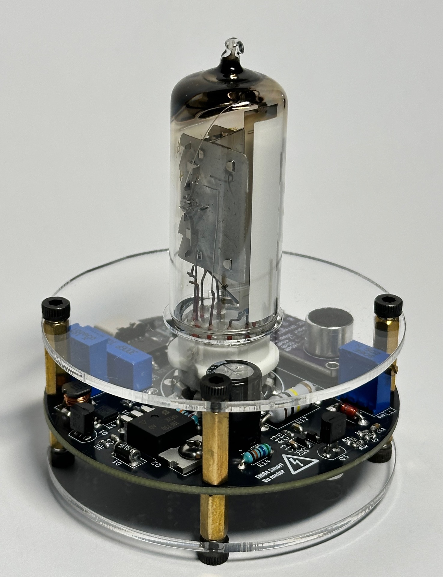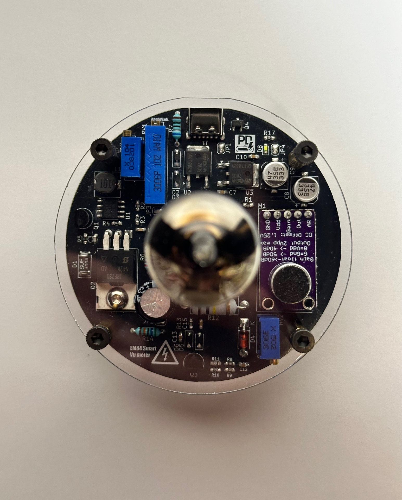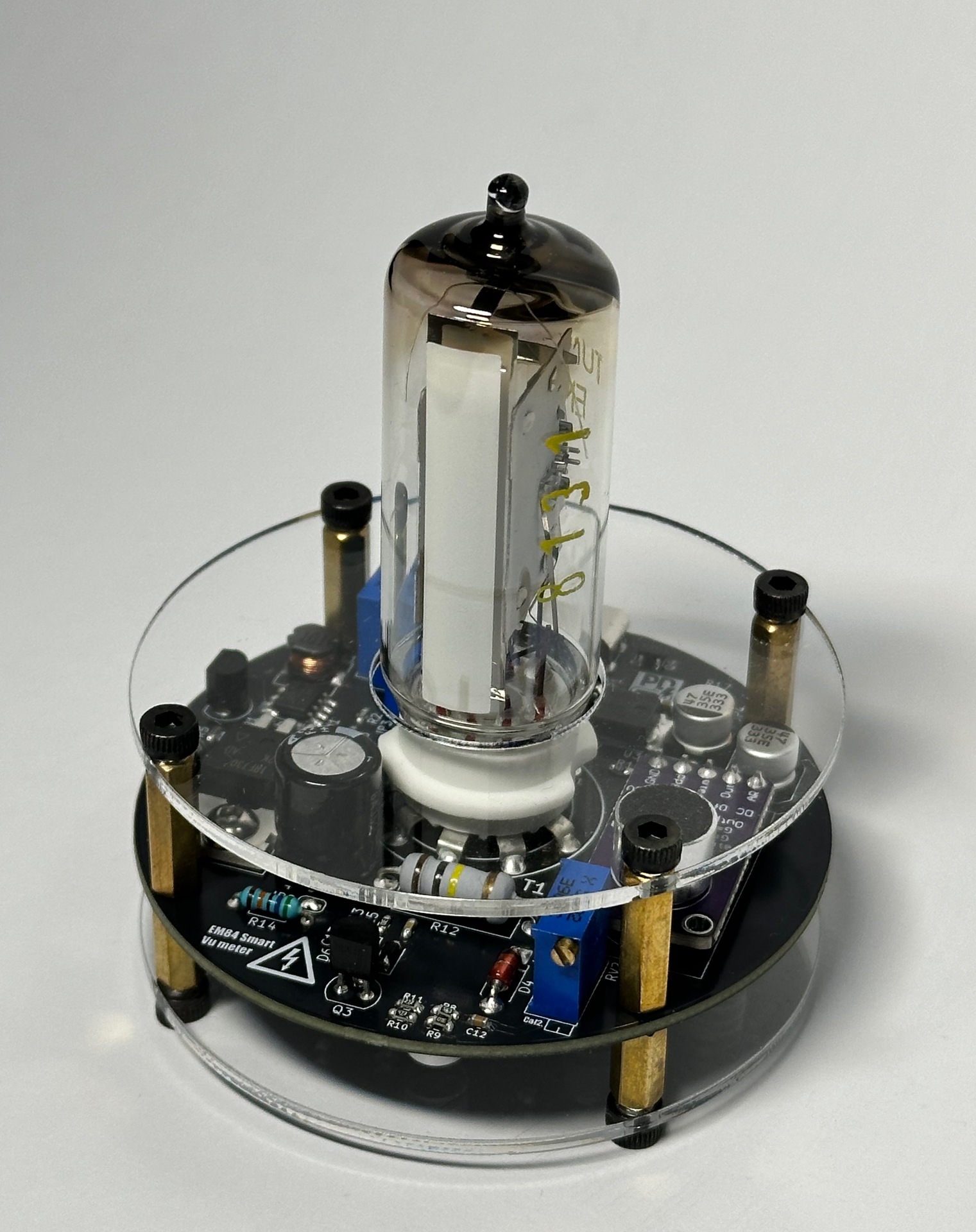 Közel 5 éve nem jártam erre, így örömmel konstatáltam milyen szépen él a topic. Régi bakancslistás történet egy EM84-es csővel épített kivezérlésjelző. Tervezés előtti főbb kritériumok kompakt méret, mikrofonos bemenet, usb tápellátás. Szerencsére sikerült még bontatlan Tungsram csövet, foglalatot vásárolnom így minden adott volt. KiCad-ben tervezve, a plexik pedig lézervágottak. Működés közben