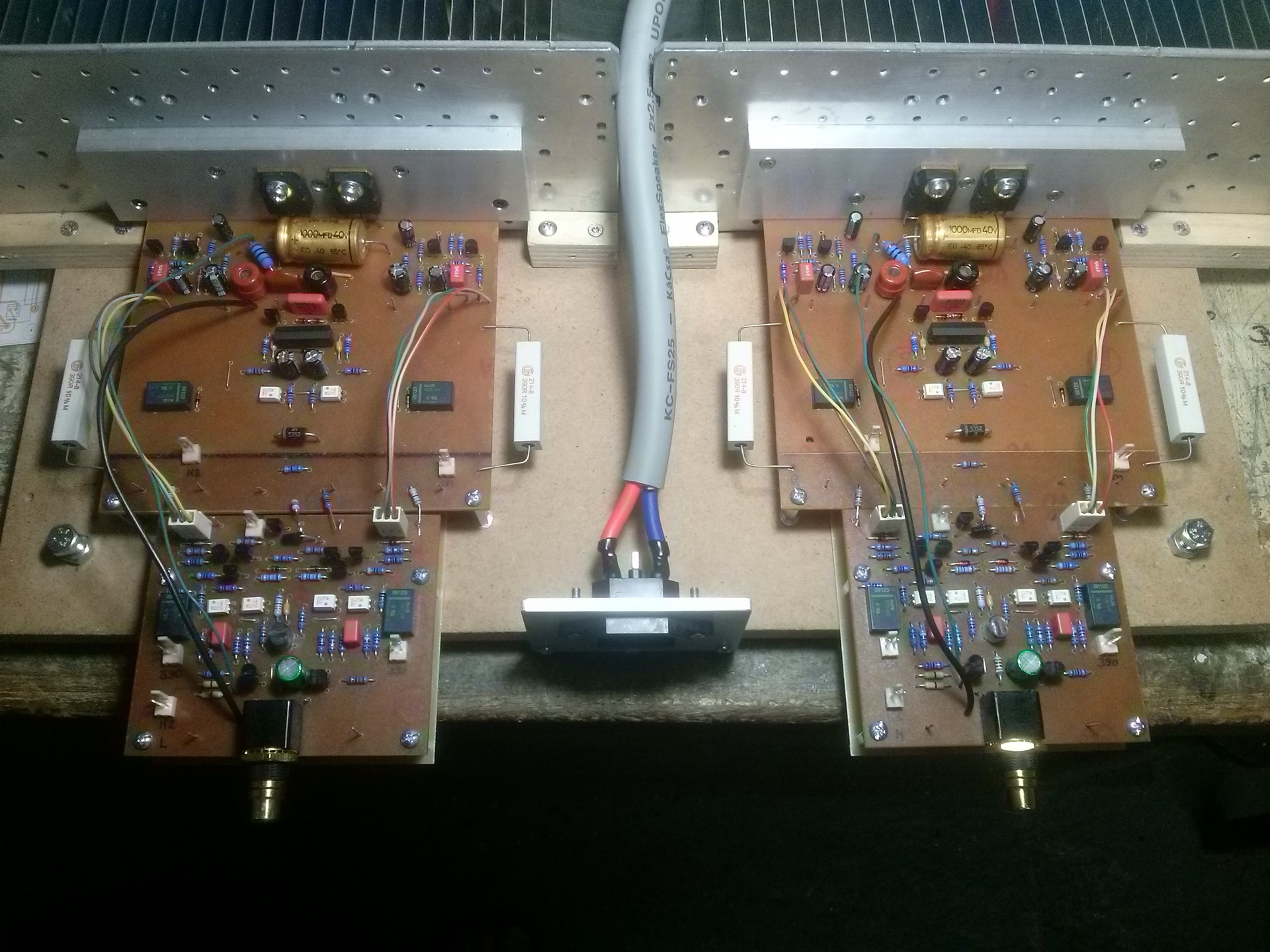 Újra megnéztem a THD-t a kaszkód jFET-ekkel is. Csökkent. Tehát nem csak a termikus torzításra van jó hatással, de a fokozat kimeneti impedanciáját is növeli. A nyugalmi áram alig van hatással a keresztezési torzításra. AB osztály - deszkamodellSziasztok! Kicsit elszakadva a szimulátortól, egy újabb deszkamodell készült TG barátom jóvoltából a korábban kitalált, földelt kimenetű, AB osztályú erősítő működési elvét csiszolgatva. Még az áramlimit nincs ráhekkelve a panelre, (van rá elméleti ölet, hogy ne növelje a torzítást - de majd a gyakorlatban kiderül, hogy így ban-e).Ez a deszkamodell kapott hűtőbordát, így 100W feletti teljesítménynél is le lehetett mérni a torzítását (pontosabban inkább THD+N). A méréskor a legnagyobb kivezérlés 30V RMS (42,2vpeak), az erősítő ±45V-ra beállított labortápokról működött. A torzításmérés Audio Precision mérőrendszerrel történt. Gyakorlatilag a teljes HF sávban 0,0004% alatti torzítást produkált a végfok 8Ω-os műterheléssel vizsgálva. A következő verzió, ha minden jól megy, gyári, 4 rétegű panelre készül majd. Szerintem ezt már érdemes lesz meghallgatni a gyakorlatban is... A kapcsolásban sok munka van, szerintem TG barátom sokkot kapna ha feltenném ide szóval bocs ezért, de a deszkamodellen látható alkatrészekből szerintem pár dolog kitalálható. Hogy ezen kívül mennyi publikus, annak eldöntését TG barátomra hagyom. Nekem egyelőre továbbra is elegendő a kis D osztályú amit évek óta hallgatok, számomra egyszerűen csak arról szól, hogy kár lett volna a "polcon hagyni" ennek az erősítőnek az ötletét. Persze lehet, hogy egy kisebb teljesítményű, sztereó változatot majd összedobok valamikor, hogy nekem is legyen egy referenciám.