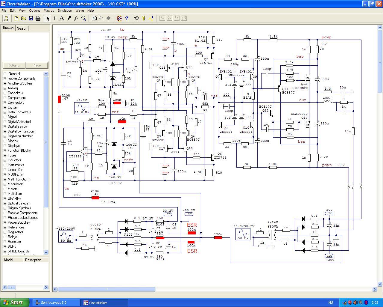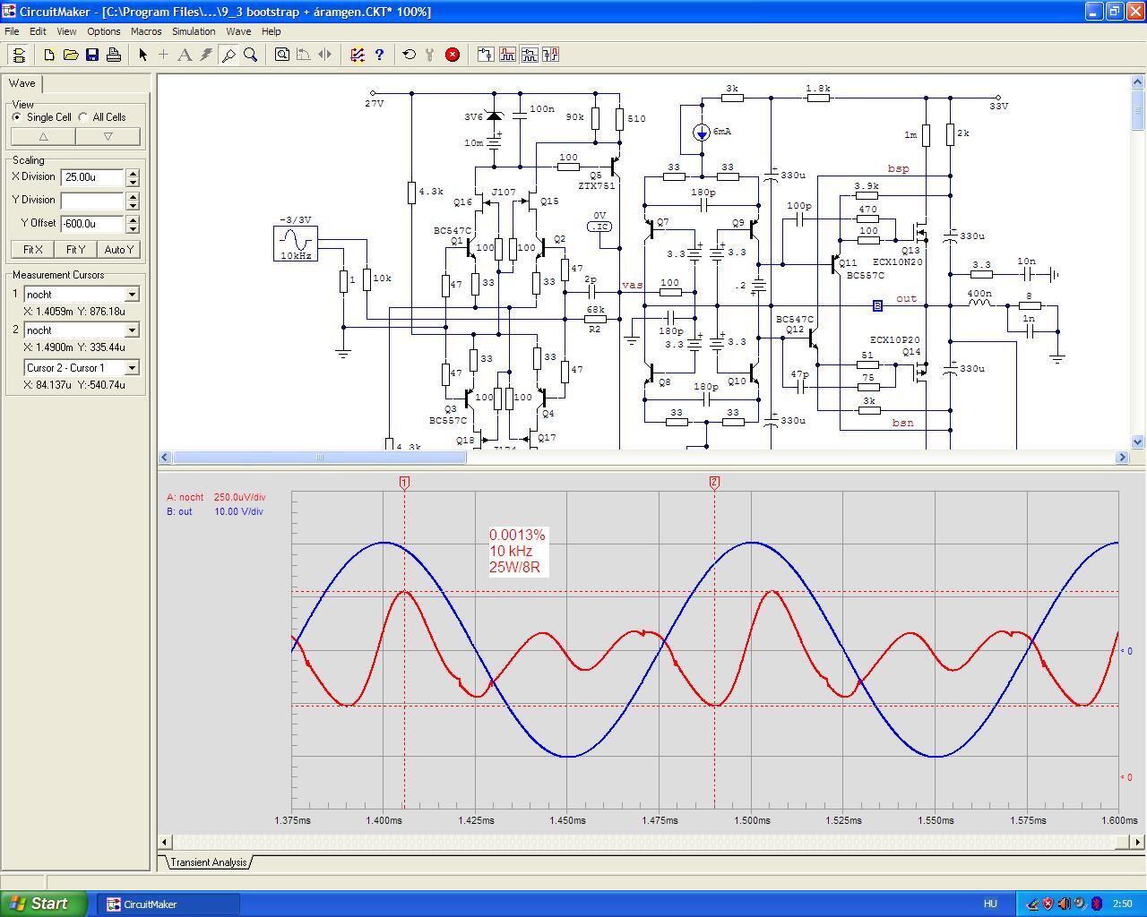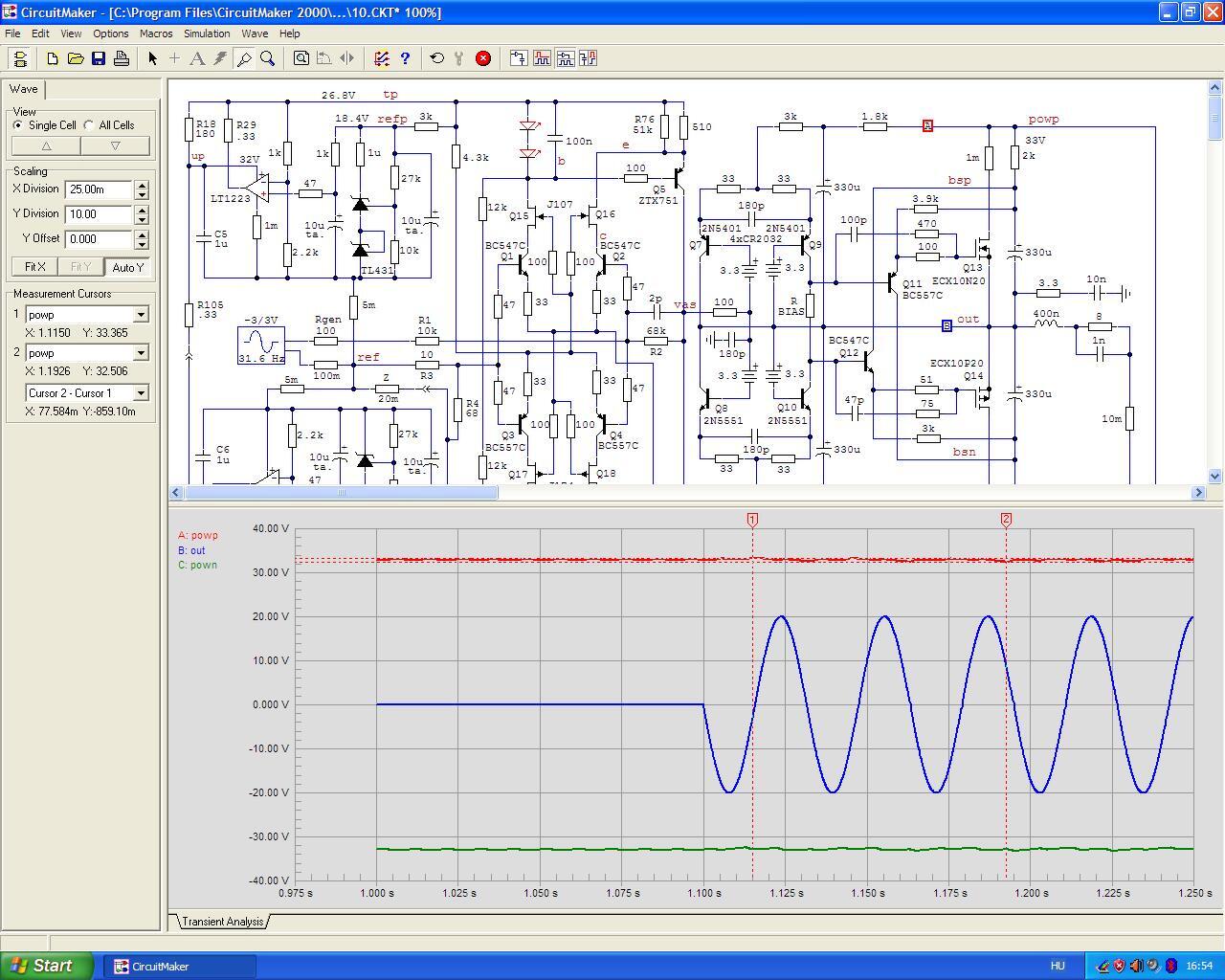 Azt hiszem ezt a kapcsolást már nem fogom piszkálni (és a nyákterv is készen van hozzá). Majd játszok valami mással tavaszig. És nem is akarok többet kipréselni belőle 20 W-nál... maradjon benne az a 10-12 V veszteség, viszont cserébe nem csökken le a végfetek meredeksége és transzkonduktanciája. Egy nagy teljesítményű végfok tervezéséhez egészen másként kell hozzáállni, de nekem nincs szükségem ennél többre.